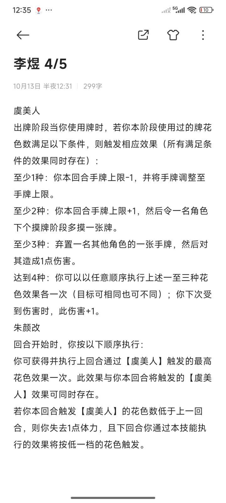霍去病 体力4 手牌上限51.骠骑:回合开始时摸一张牌,本回合打出首张杀无视距离且无视防具2.以战养战:自己造成伤害后获得受伤武将一张牌,如果获得的是装备牌则摸一张杀且本回合出杀次数+13.天妒英才:锁定技 回合结束后,若本回合造成的伤害>1,则失去一点体力并选择一名其他武将失去一点体力主要聚焦于破防,缴获装备牌增强自己战斗力,可以有波小爆发,不阴间但挺全面