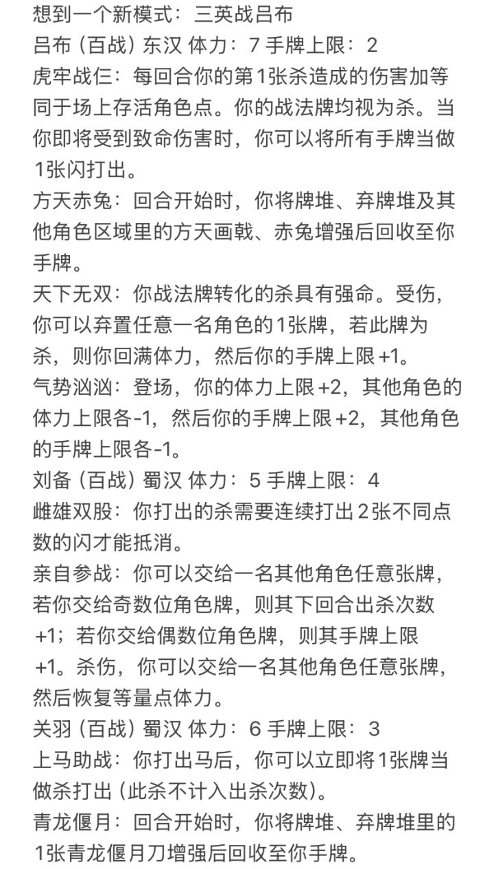 想要新武将吗,新模式怎么打,看图陈胜+袁绍百万雄兵有百万雄兵,天赋选加战法伤害、加初始手牌、加摸牌、加获得战法牌装备选乌骓、连弩、白蹄乌过牌(发育起来就不需要了,手里少说一百多张牌)看图id:拔刀能留住落樱吗,加我一起玩