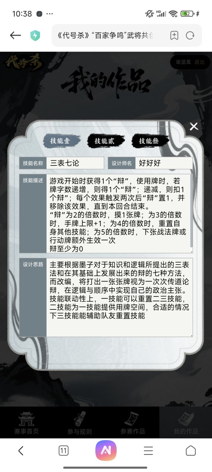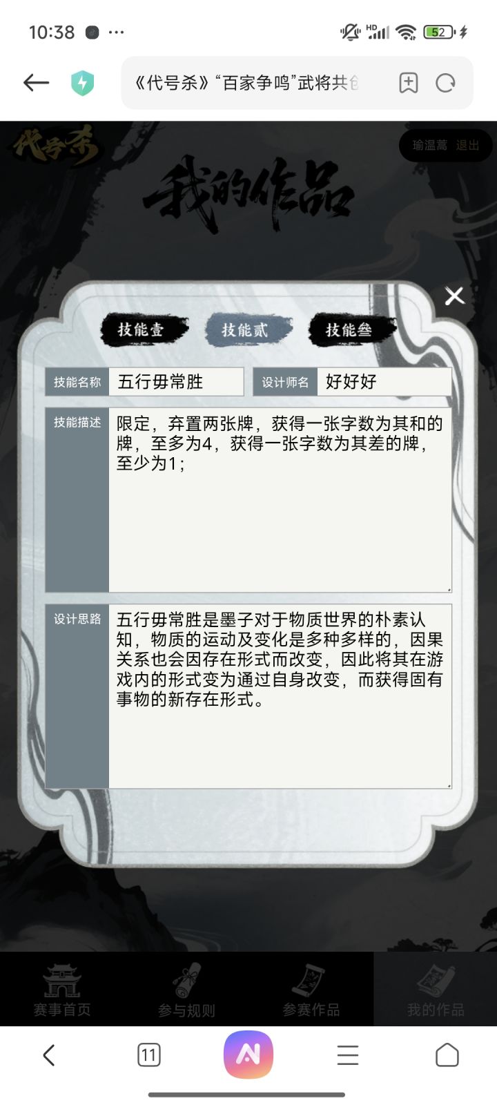 设计来源:墨子作为墨家代表,我希望他能作为百家争鸣中,墨这一流派的核心与玩法的体现。我给墨家的定位是共损共伤,也就是兼爱非攻这一技能,其他墨家代表也后续会拥有这个技能。随后,结合形象以及避免落入俗套,将墨子重视逻辑,讲究辩论,作为核心,既“辩”这一标记。使用过程中,结合墨子对于自然物质的理解和对科学的追求,用倍数作为触发条件。技能讲解:二技能的五行毋常胜是其对自然物质的理解,辅助其开展辩