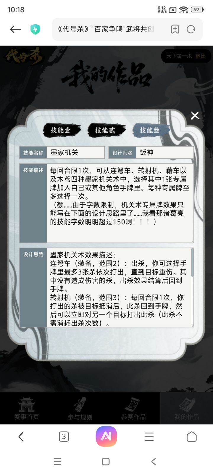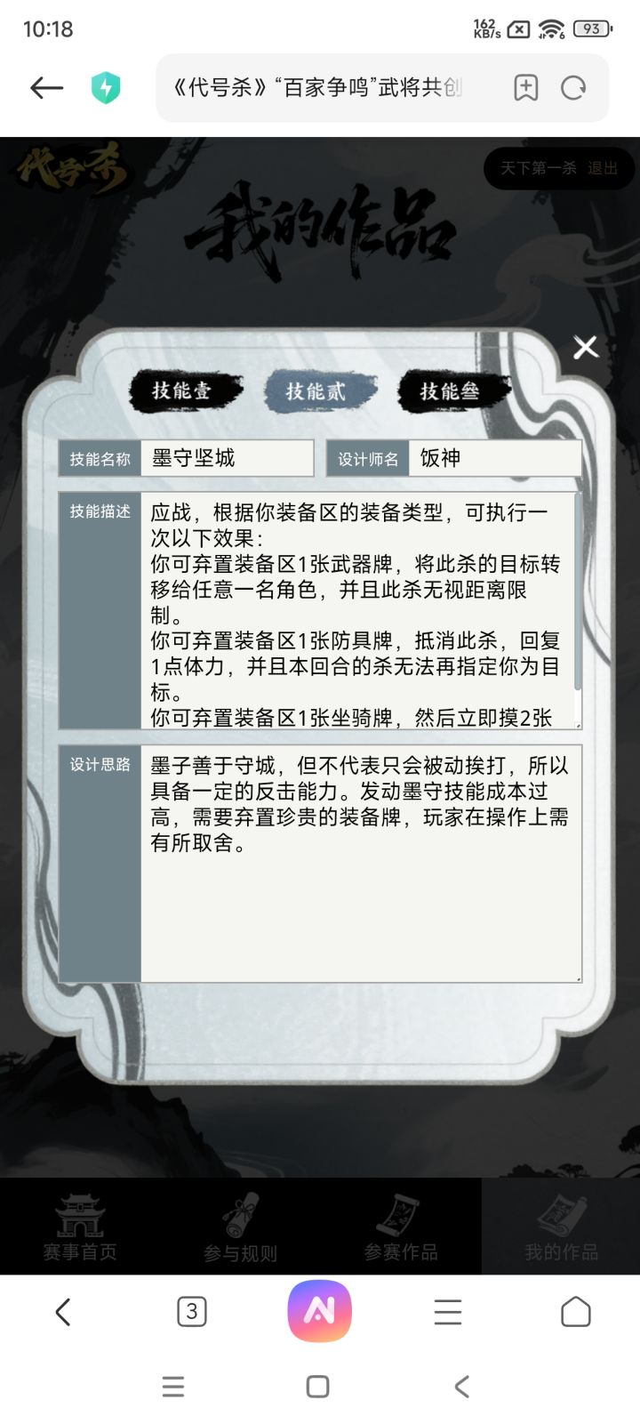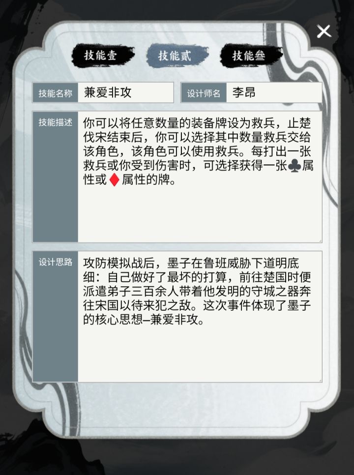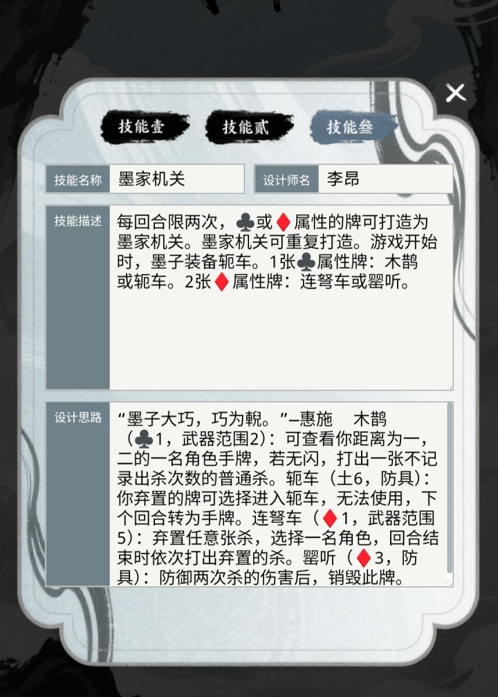 这版还是有很多用词不当的地方的,大伙见谅着看吧一技能因为是当一名角色,所以可以指定自己为目标,当然代价就是如果拼牌输了会挨多一刀。武器木鹊是给查看的角色来上一刀不占出杀次数的虚拟杀,但是我记得这游戏没有虚拟杀这个概念,所以就没加虚拟上去了,怕管方不给过。我设计这这版墨子大概就是保镖+打兵器的武将方向(什么男版孙尚香),有轭车和二技能不怕弃牌,就是怕拆顺。#游戏日常 #