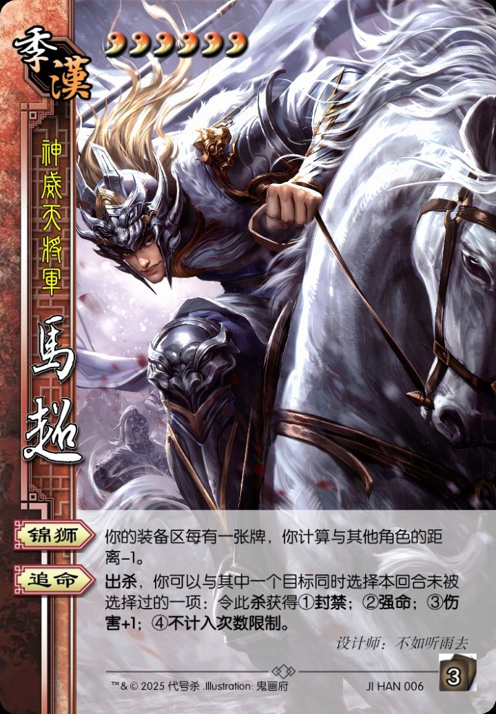 各位好,这里是听雨的代号杀DIY改将专栏:马超 6勾玉3手牌上限势力:季汉称号:神威天将军设计师:不如听雨去画师:鬼画府锦狮子:你的装备区每有一张牌,你计算与其他角色的距离-1。血仇追命:出杀,你可以与其中一个目标同时选择本回合未被选择过的一项:令此杀获得①封禁;②强命;③伤害+1;④不计入次数限制。#代号杀 #代号杀不如听雨去 #代号杀武将 #代号杀diy #不如听雨去的diy#浅评一下