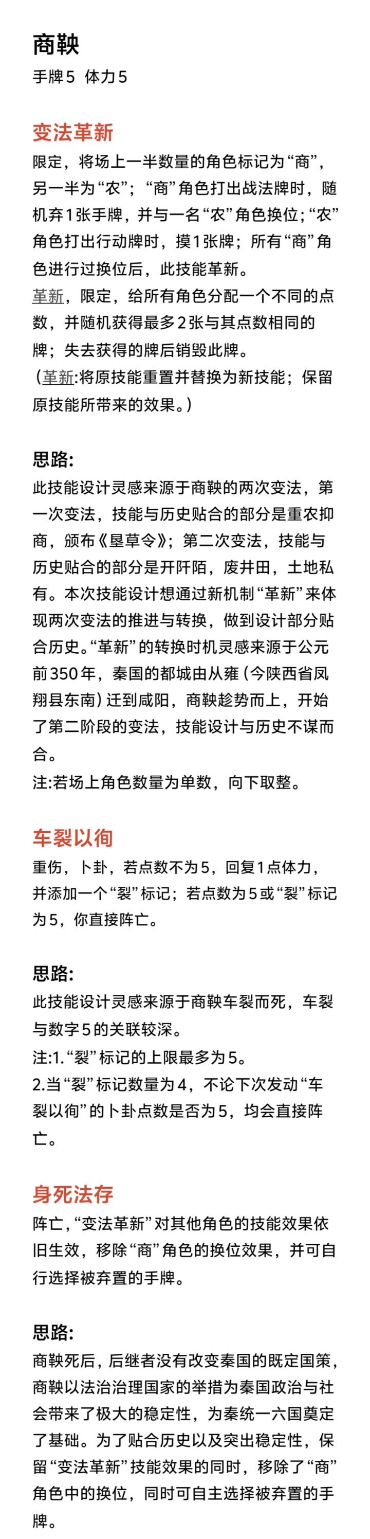 我觉得设计角色的理念是要根据历史典故,尽可能的给予角色特色,提高还原度。。 商鞅:5血 5手牌上限 技能一:更法明制 设计理念: 商鞅变法体现法家的思想,技能设计完全复刻这一理念: 1. 【连坐督责】 原型:商鞅推行的"连坐制",要求民众互相监督。 2. 【军功授爵】 原型:废除世袭爵位,改按军功授爵。 3. 【刑赏无赦】 原型:"刑用于将过"