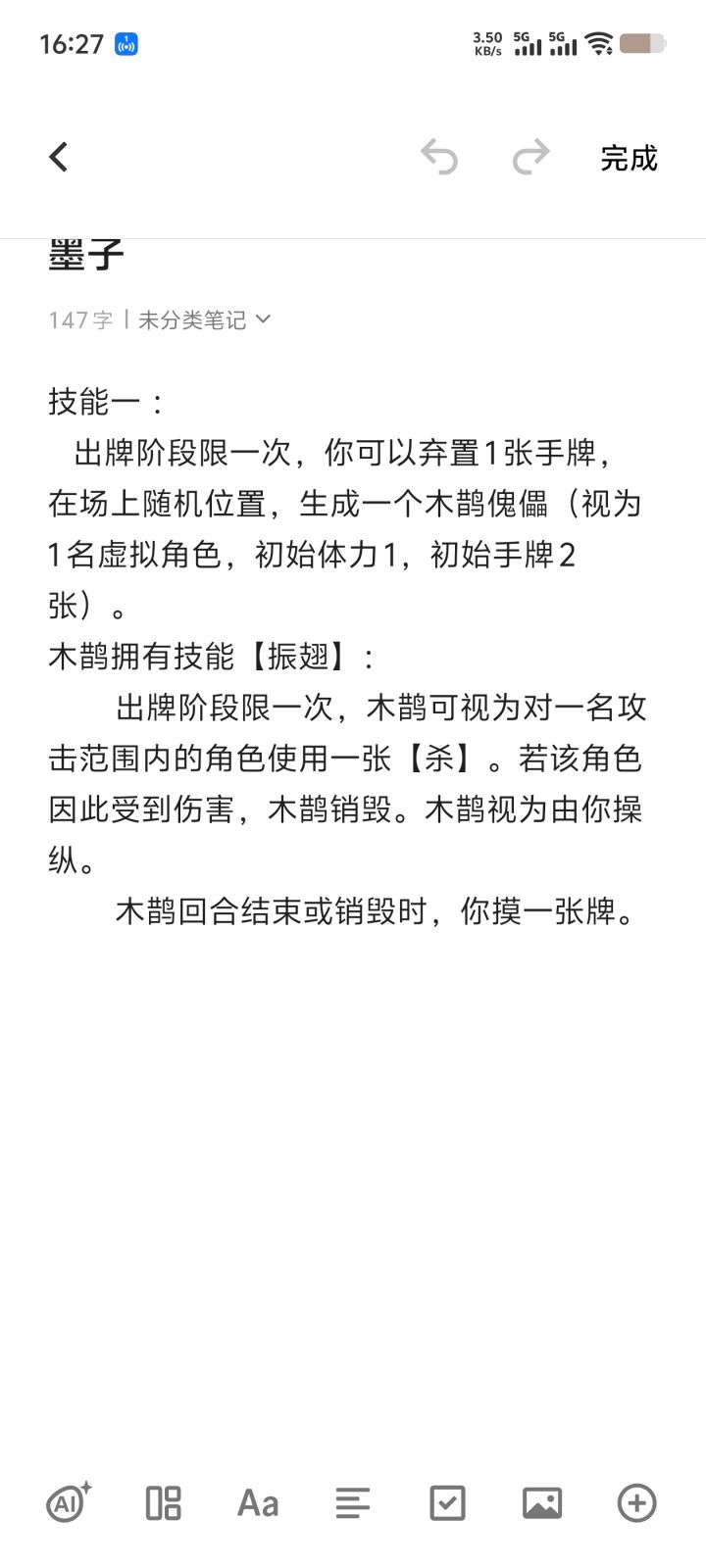 我觉得在史实基础上给予角色特色才能创作出好角色。墨子 4血 4手牌上限技能一:御木为鹊 出牌阶段限一次,你可以弃置1张手牌,在场上随机位置,生成一个木鹊傀儡(视为1名虚拟角色,初始体力1,初始手牌2张)。 木鹊拥有技能【振翅】: 出牌阶段限一次,木鹊可视为对一名攻击范围内的角色使用一张【杀】。若该角色因此受到伤害,木鹊销毁。木鹊视为由你操纵。木鹊回合结束或销毁时,你摸一张牌。设计理