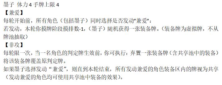 笔者也是第一次设计武将,看了很多其他武将的设计,感觉要么是小作文(笔者自己写商鞅的时候就写的老长了),要么就是缺少一些历史感,要么就是什么都好就是机制有点无聊。笔者希望的武将是技能描述字数中等,最好有一点独创性和可玩性,还能兼顾一些历史底蕴。于是就有了【墨子】的武将设计。设计师名称:上代务编号:10367武将名:墨子体力:4 手牌上限:4【兼爱】每轮开始前,所有角色(包括墨子)同时选择