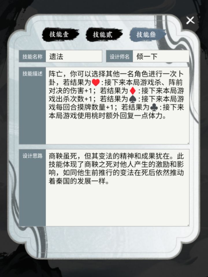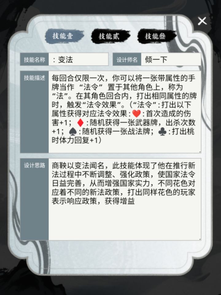 商鞅是中国历史上第一位彻底的改革家,他的变法对秦国乃至中国历史产生了深远影响,为后来秦国统一六国奠定了基础。在我看来,他辅佐秦孝公进行变法,是作为谋臣的形象,所以打算将商鞅设计成辅助型武将,贴合而不是一个输出型武将的设定。🔴技能一:变法(主动技能)每个回合仅限一次,你可以将一张手牌当作 “法令” 置于其他角色上,称为 “法”。当其他角色回合内打出与“法令”相同属性的牌时,你和其各摸一张牌