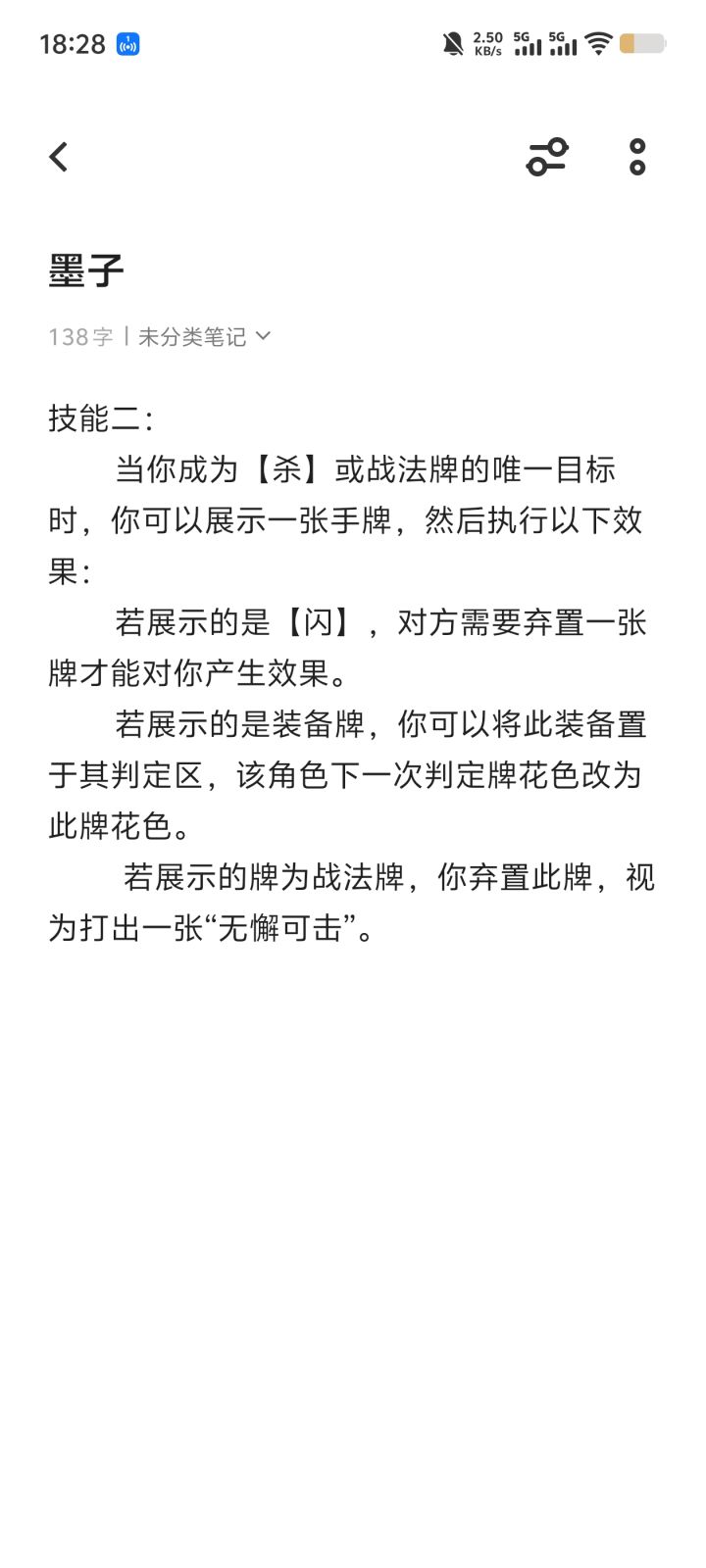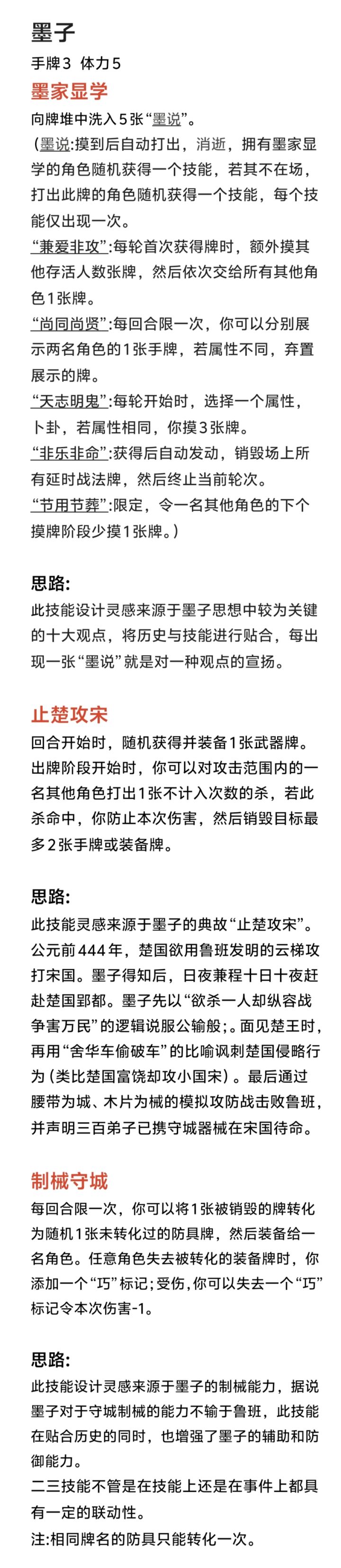 这次设计墨子和商鞅,主打一个上下限均高,字数虽然乍一看很多,但哪怕是新手看过一遍后,结合代号杀的技能写法,都能够直接明白技能的玩法,还请大家可以试着耐心看完。墨子手牌3 体力5墨家显学向牌堆中洗入5张“墨说”。(墨说:摸到后自动打出,消逝,拥有墨家显学的角色随机获得一个技能,若其不在场,打出此牌的角色随机获得一个技能,每个技能仅出现一次。“兼爱非攻”:每轮首次获得牌时,额外摸其他存活人