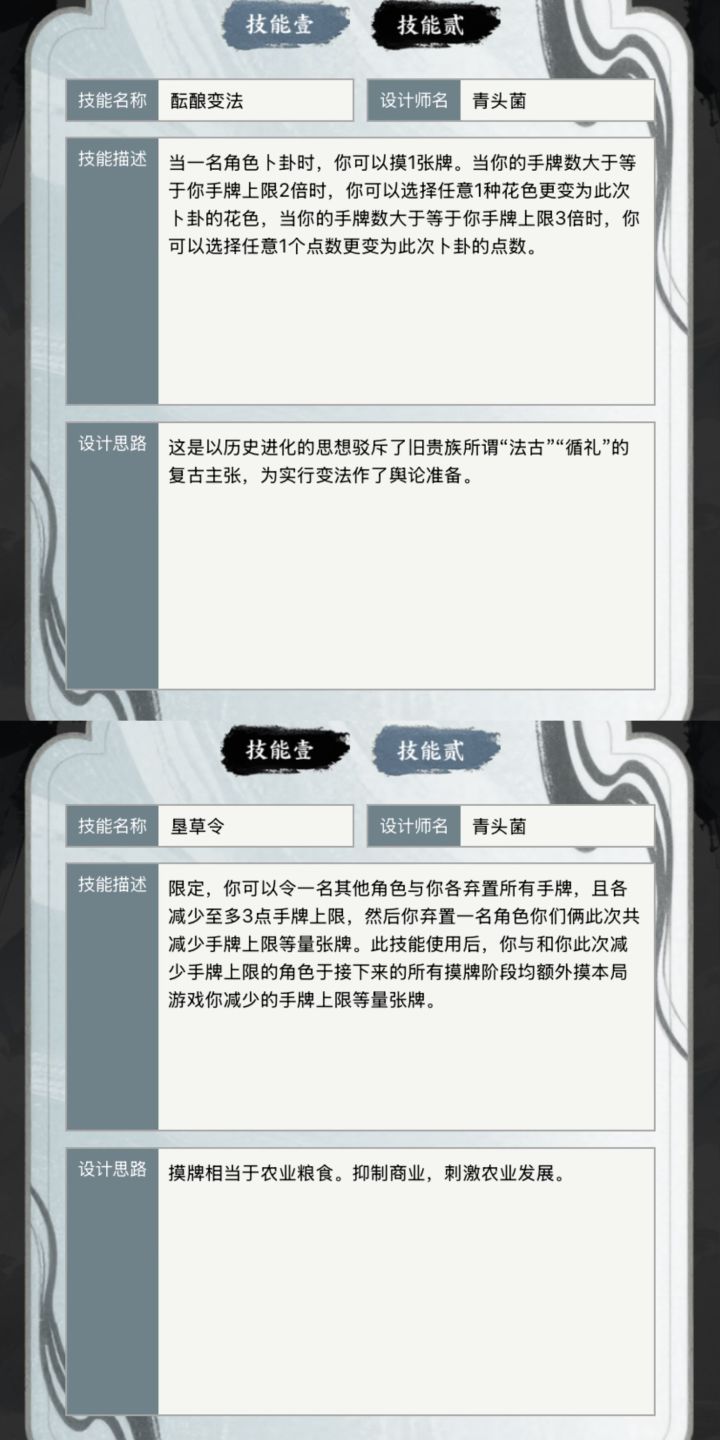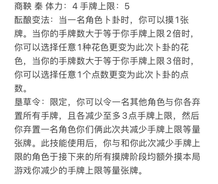 整活设计,不建议效仿。怎么说呢,听雨最近状态不太好,“饼上雕花”系列还没写完就遇上百家争鸣…这两个投稿武将还有待打磨,在正式投稿之前先发一点整活叭…商鞅:“鞅宁拼一死,旧贵族安敢一战!”商鞅 4血5牌变法图强:游戏开始时,你获得20点变法值。当你获得牌/造成伤害/受到伤害时,你获得5点/10点/15点变法值。当你的变法值首次变化至25/50/75以上时,你随机获得一个技能名包含“法”的技能