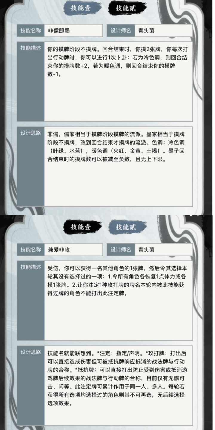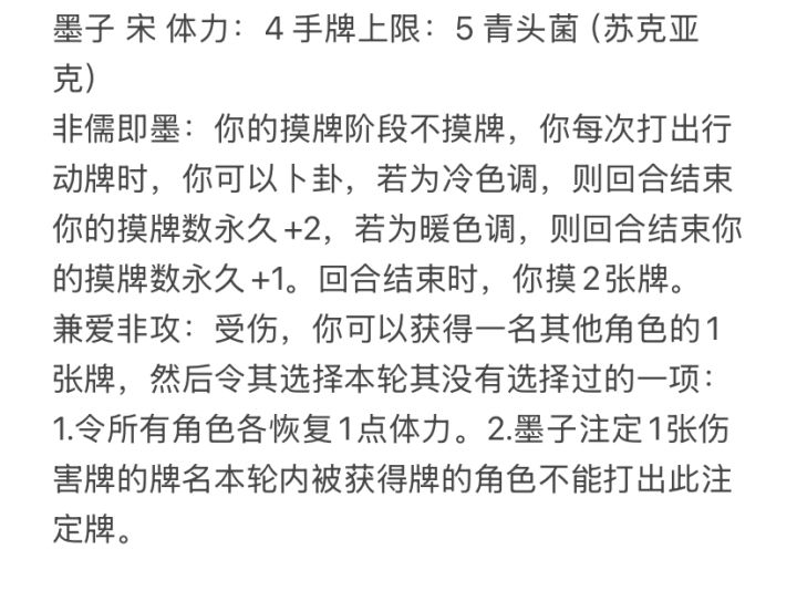 #代号杀 #墨子 我设计了墨子的技能。先讲设计思路,墨者的核心理念是兼爱非攻与尚贤天志。他们反对兼并战争,想尽力保全所有的国家尤其是那些小国。 需要注意的是墨子对于战争的态度,他虽然反对不义之战,但也不会天真到希望所有人放下武器。救宋过程中他就是在和公输在兵棋推演过程中打败他来让他意识到攻宋是无法获取成功的。这是典型的以战止战的思想,有剑不用和没剑是两码事。 墨子是墨家的第一位巨子,巨子是