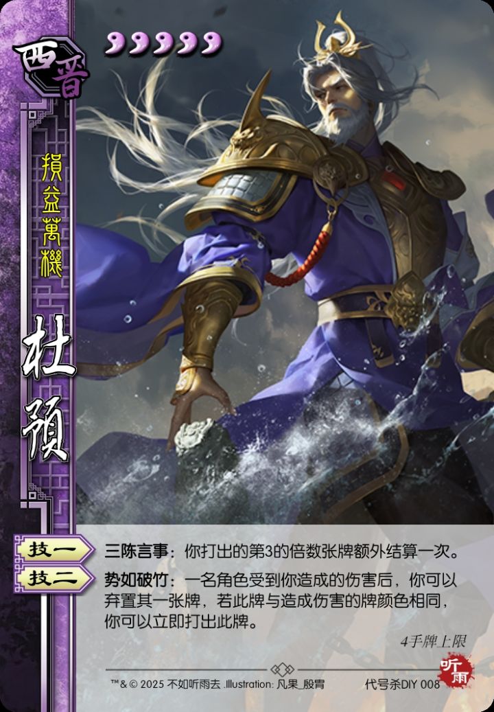 杜预 5勾玉4手牌上限 势力:西晋称号:损益万机设计师:不如听雨去画师:凡果_殷胄技一:三陈言事:你打出的第3的倍数张牌额外结算一次。技二:势如破竹:一名角色受到你造成的伤害后,你可以弃置其一张牌,若此牌与造成伤害的牌颜色相同,你可以立即打出此牌。#代号杀 #代号杀武将 #代号杀新武将