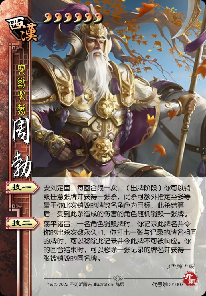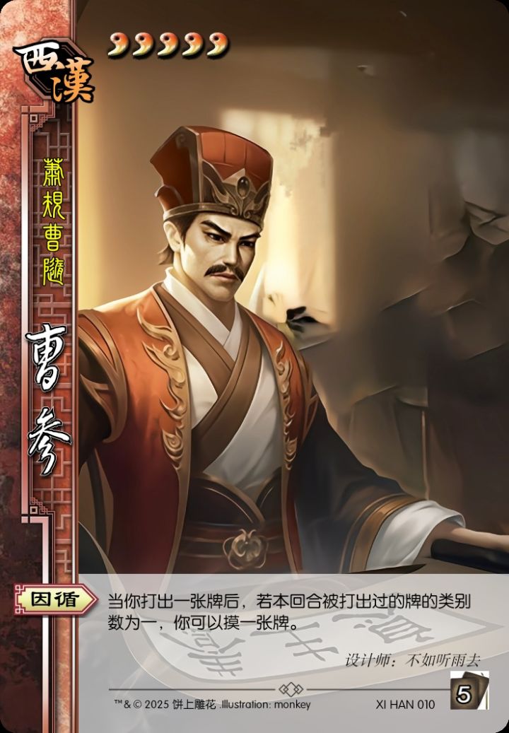 欢迎来到听雨的个人自设武将扩展包【饼上雕花】系列专栏!本扩展包包括但不限于《代号杀》官方武将个人向改将和番外包个人DIY。扩展包整体强度体系以本包为准,不考虑上线《代号杀》游戏(如果有机会上线的话)的实际强度。与官方武将相比,该扩展包的武将体力上限与手牌上限之和改为10而非官方的9“萧何为法,若画一;曹参代之,守而勿失。载其清净,民以宁一。”曹参 5勾玉5手牌上限势力:西汉称号:萧规曹