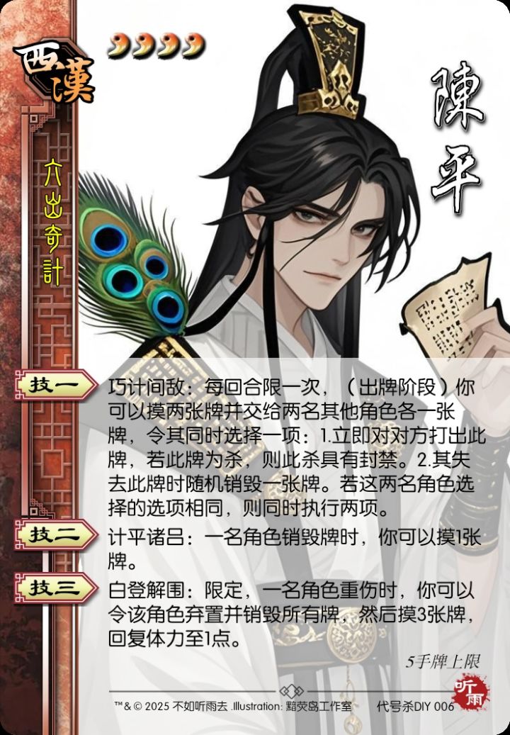吕雉最害怕的一集…详细技能如下:西汉 陈平 4勾玉 六出奇计技能:技一:巧计间敌:每回合限一次,(出牌阶段)你可以摸两张牌并交给两名其他角色各一张牌,令其同时选择一项:1.立即对对方打出此牌,若此牌为杀,则此杀具有封禁。2.其失去此牌时随机销毁一张牌。若这两名角色选择的选项相同,则同时执行两项。技二:计平诸吕:一名角色销毁牌时,你可以摸1张牌。技三:白登解围:限定,一名角色重伤时,你可以