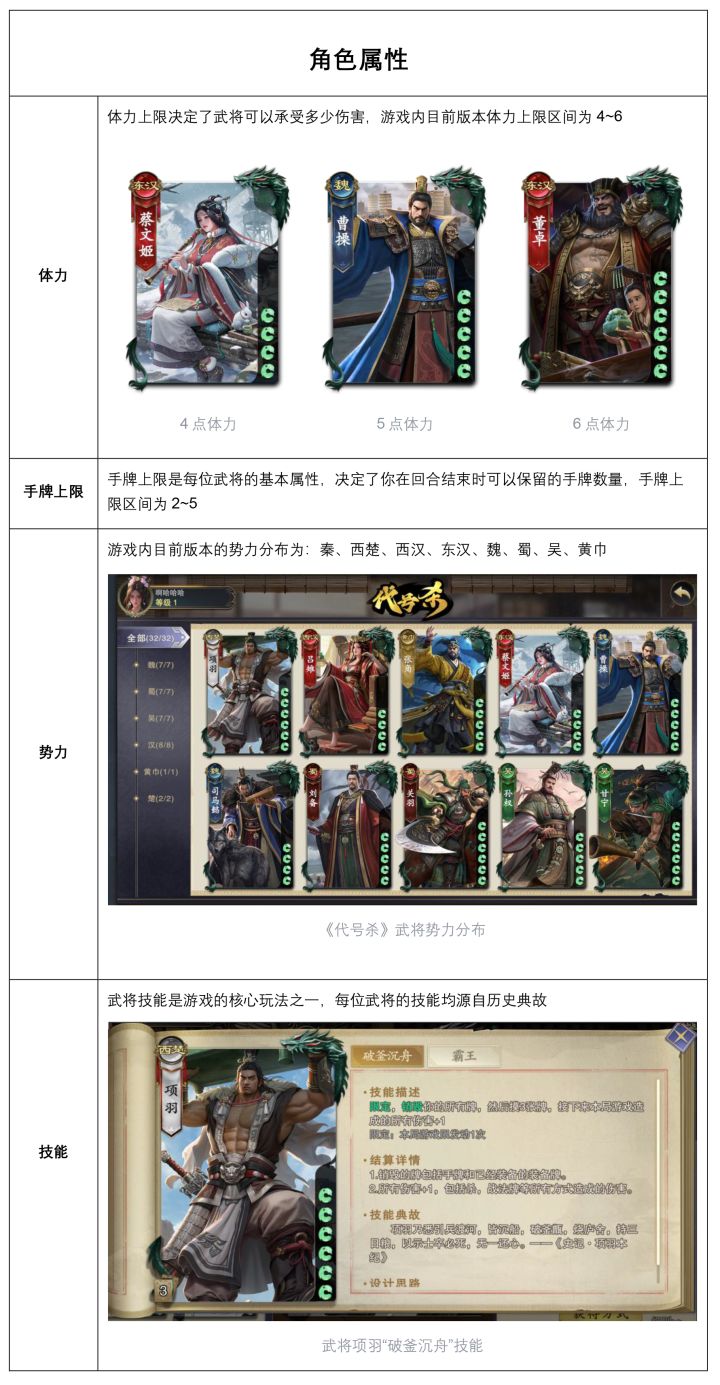 大家好,我是策划烙饼;今天和大家分享一些《代号杀》的基础玩法设定,同时我也想和大家聊一聊这些玩法模式与手牌的设计思路。角色:角色体力、势力、手牌上限、技能的技能介绍对于游戏的基础规则我们的想法是这样的。首先是武将的数值模型,我们把手牌上限作为独立的固定的属性,这样武将即使体力降低了,回合外的防御力也可以保持,多一些翻盘的可能,同时在技能设计上也可以有更多空间。然后每个角色的初始属性的设计