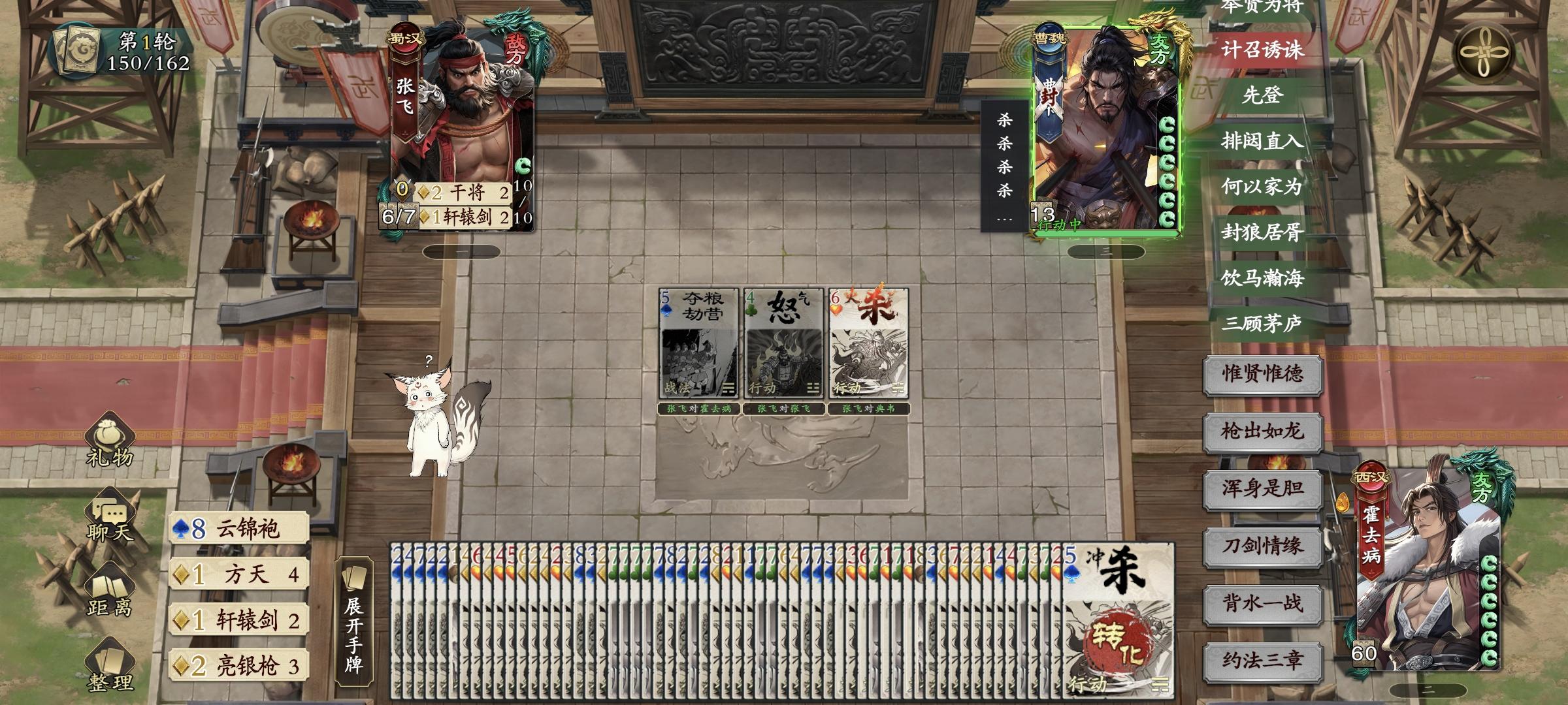 没有和真人组队,就和人机组队上了大将军,因为我发现有的新手技能都认不全,然后和那些大佬打,他们只会嫌你这嫌你那有次我出无懈出快了,然后那小子别点了无懈,老子导致出了两张无限,就骂我不会但是这个人机我就发现有一些问题,他有些技能不会用,比如周勃的那个补牌技能他就不会用,然后在对面明显的没有闪情况下,人机已经有了羽扇 酒 火杀,他竟然还打出了一张普通杀
