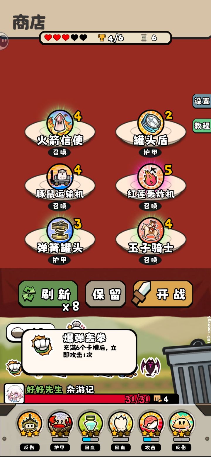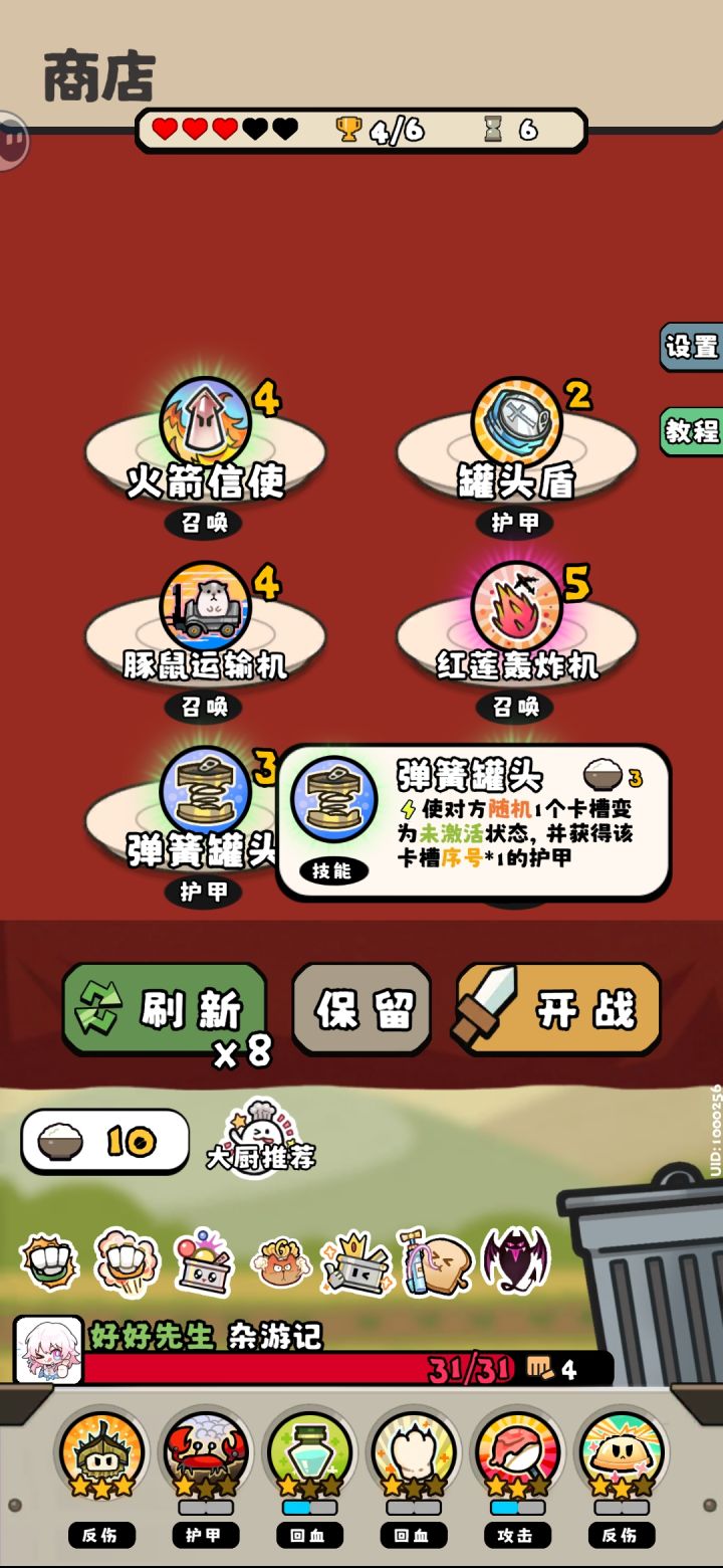 #料理乱斗 #游戏安利 #游戏种草计划 对方的弹簧罐头会影响我方的卡槽,但是爆单洪拳却可以没满六个的时候触发。这个充满的说法感觉有问题,现在的状况是你只要激活过六个卡槽就能触发,和充满这个概念有点违背啊。