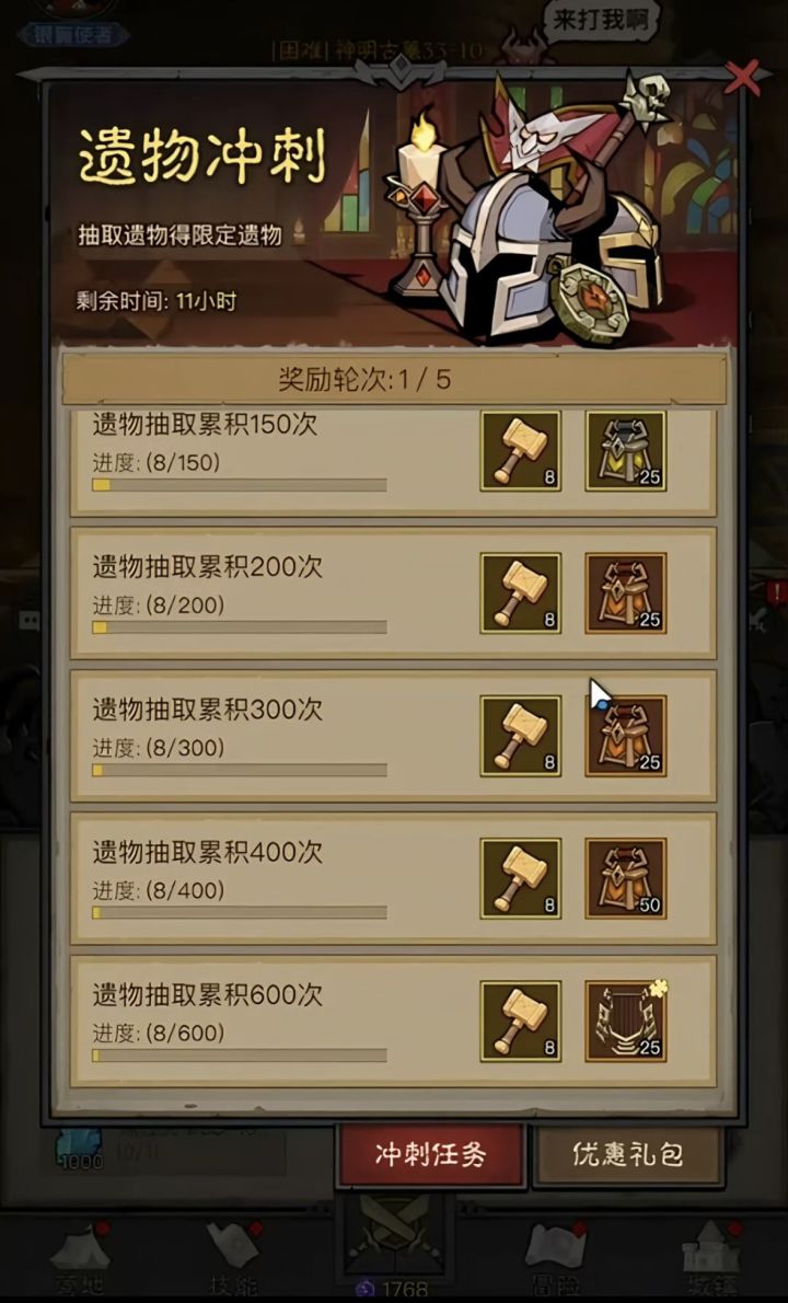 点我看往期攻略攻略交流裙:1009514497那首先注意呢,这个一物冲刺,它跟第7天开的遗物奇遇并不是同一个活动,奖励是不一样的第16天的遗物冲刺:达到200次,只有25碎片达到300次,可以拿到一个橙色的自选达到400次,可以拿两个的这个橙色遗物自选达到600次,就可以有25个红色碎片200-300这个两个档性价比不高,0氪低氪建议做到400次拿两个橙色自选才是性价比最高的,如果