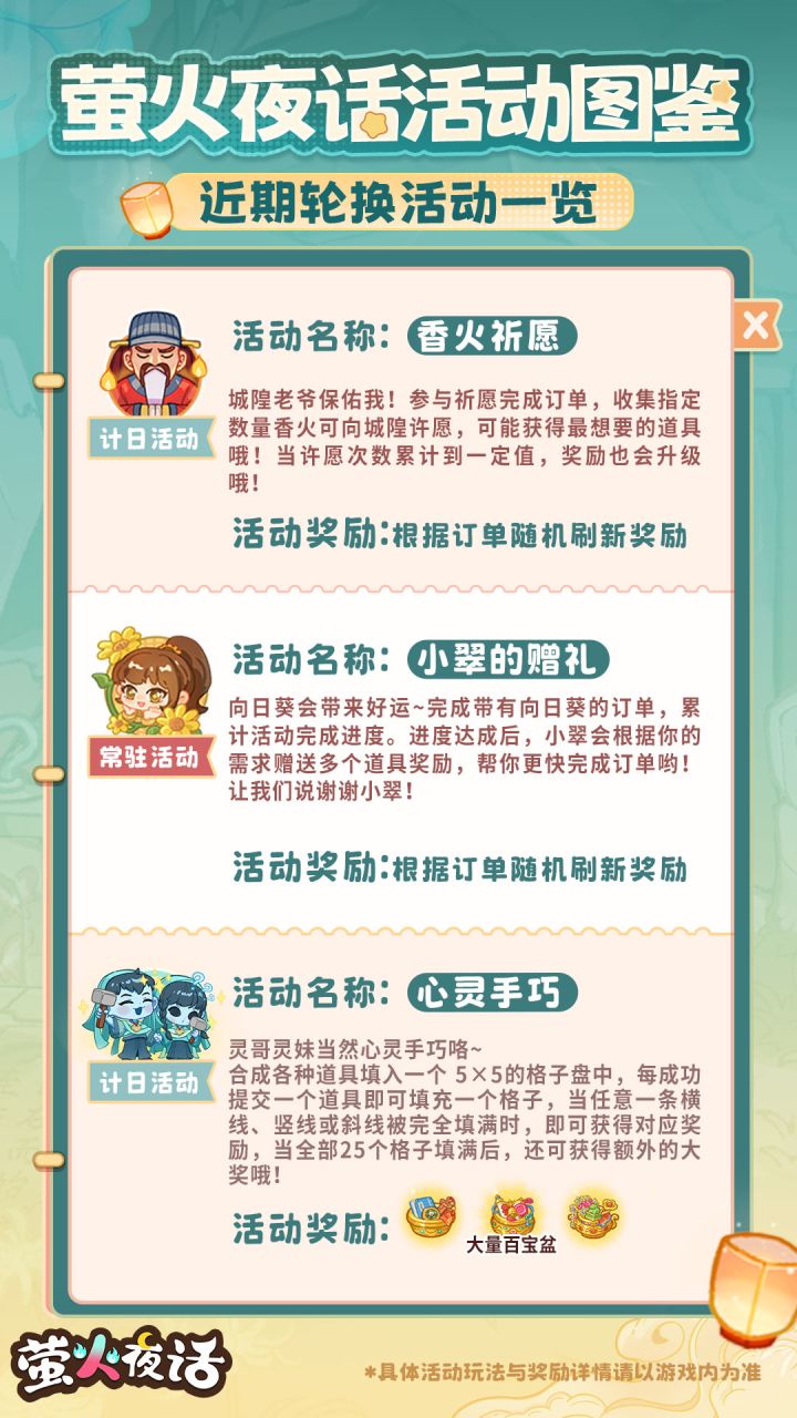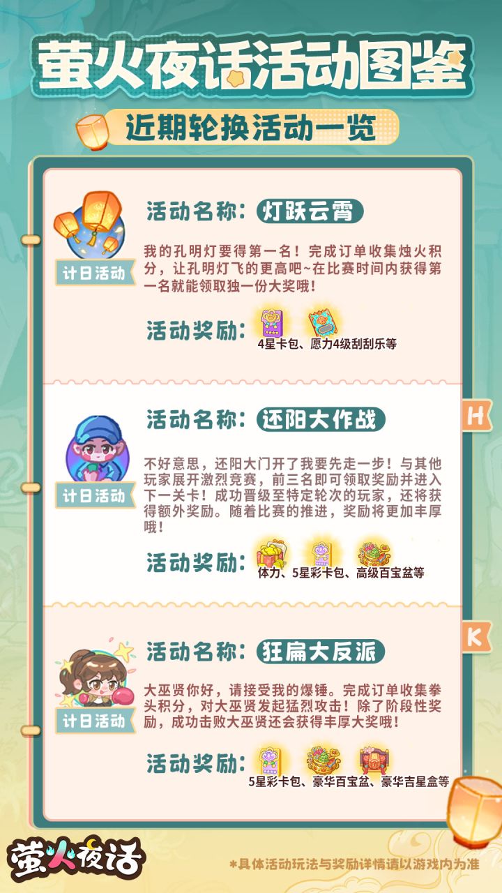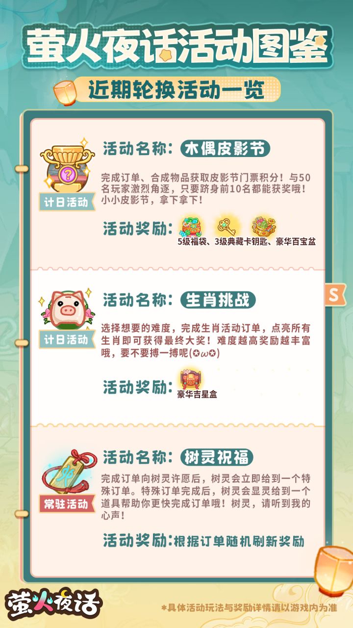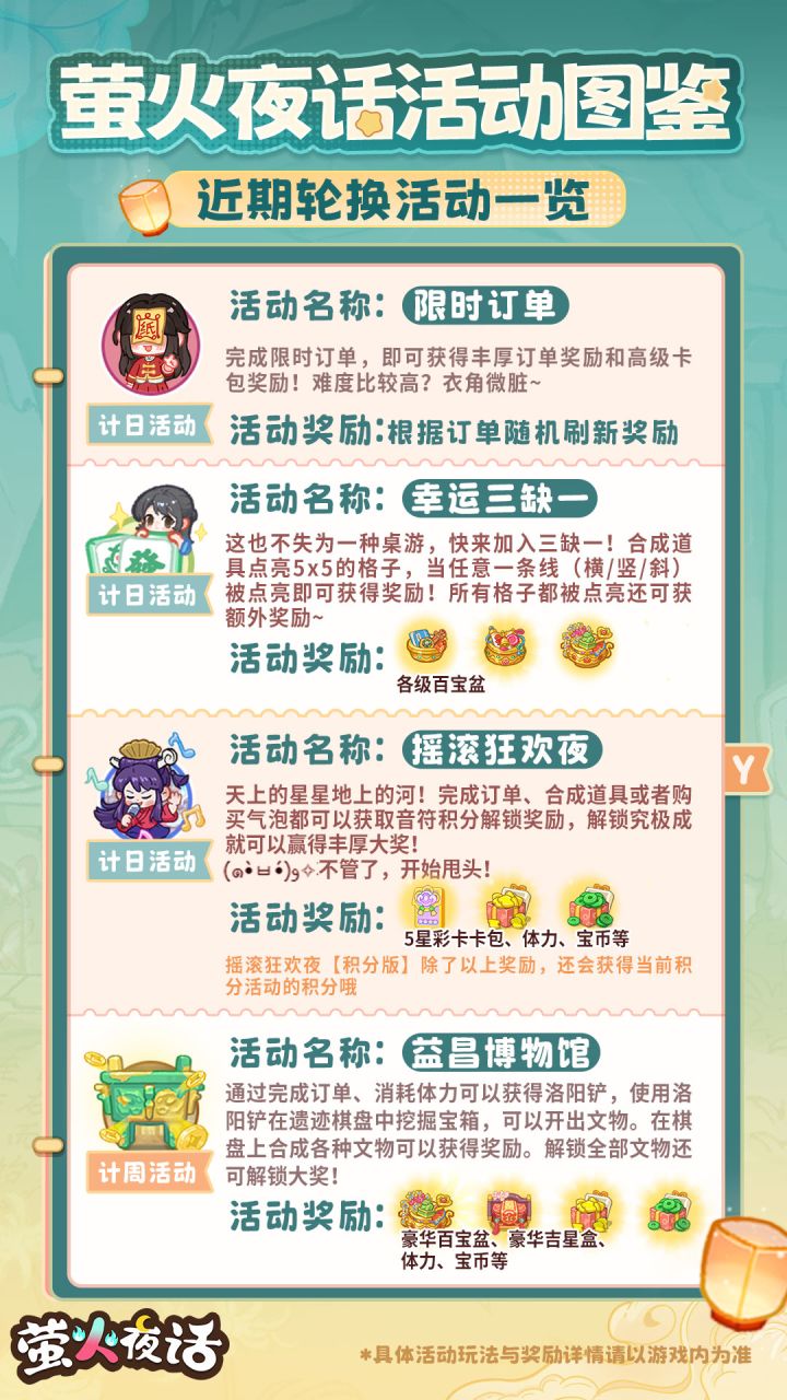 活动图鉴在手,再也不用担心忘记活动啥是啥了(bushi根据活动名首字母按照A-Z的顺序即可查找,快点击收藏起来吧ᕕ ( ᐛ ) ᕗ ——————⭐关于「瑞雪生辰宴」的双倍积分活动时间更正:「瑞雪生辰宴」将于明日1月17日以及1月20日的早上8:00再次开启双倍积分活动,活动有效期为24小时,于次日1月18日、1月21日早上8:00结束。期间只要激活该活动(首次进入棋盘即视为激活),就会立刻