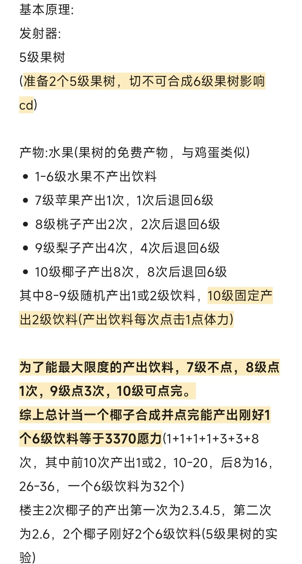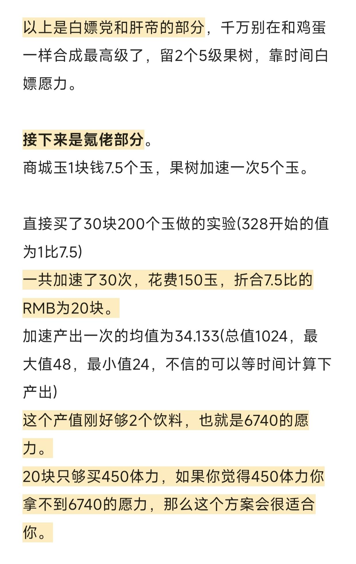 2瓶饮料换取6740愿力,白嫖肝帝必备。氪佬20块不到换取6740愿力,比买体力划算。错过鸡蛋的必备,3鸡蛋1800已不够用。据内测大佬(抖音Id:艾叶小姐)说后期没有比饮料更赚的单子。最强冲等级攻略,详见如图。补充说明:氪佬也是2个5级果树,不可升6级,图片内容已更新。因为一个6级果树cd3小时,2个5级果树一个cd3小时,一个cd 14分钟,加速14分钟的才是5玉