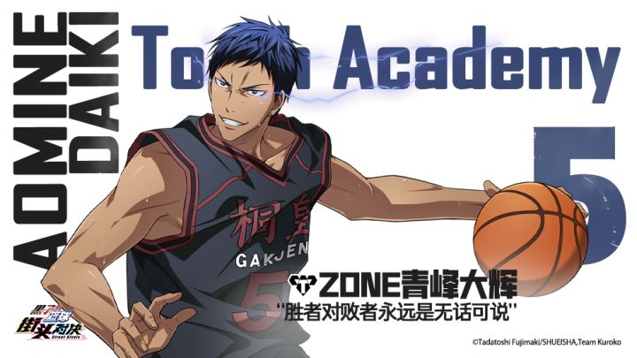 本次小葵要介绍的是「ZONE青峰大辉」!就让我们来认识游戏内的他吧~【ZONE青峰大辉】配音:诹访部顺一学校:桐皇学园原“奇迹的时代”进攻核心,能自由掌控ZONE的天赋型球员。结合无定式进攻轨迹,使球场化作他的领域。以自由奔放的姿态化身“不可阻挡的得分手”撕裂球场。【必杀技能:ZONE】青峰大辉无与伦比的篮球天赋以及对比赛的绝对专注,让他可以轻易进入ZONE状态,提升进攻命中和移动
