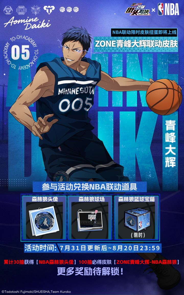 限时活动时间:7月31日更新后 ~ 8月20日✦ZONE青峰大辉球员限时夺宝"奇迹的时代"大前锋降临街头赛场!是能自由掌控ZONE的天赋型球员,以无定式进攻撕裂防线,无拘无束的球风实现攻防一体碾压! ✦NBA联动限定皮肤NBA明尼苏达森林狼联动皮肤!穿上暗蓝球衣点燃街头赛场! ✦限时试炼活动同步上线登录免费领取养成材料,完成挑战还有海量资源奖励等你来领!━━━━━━━━━━