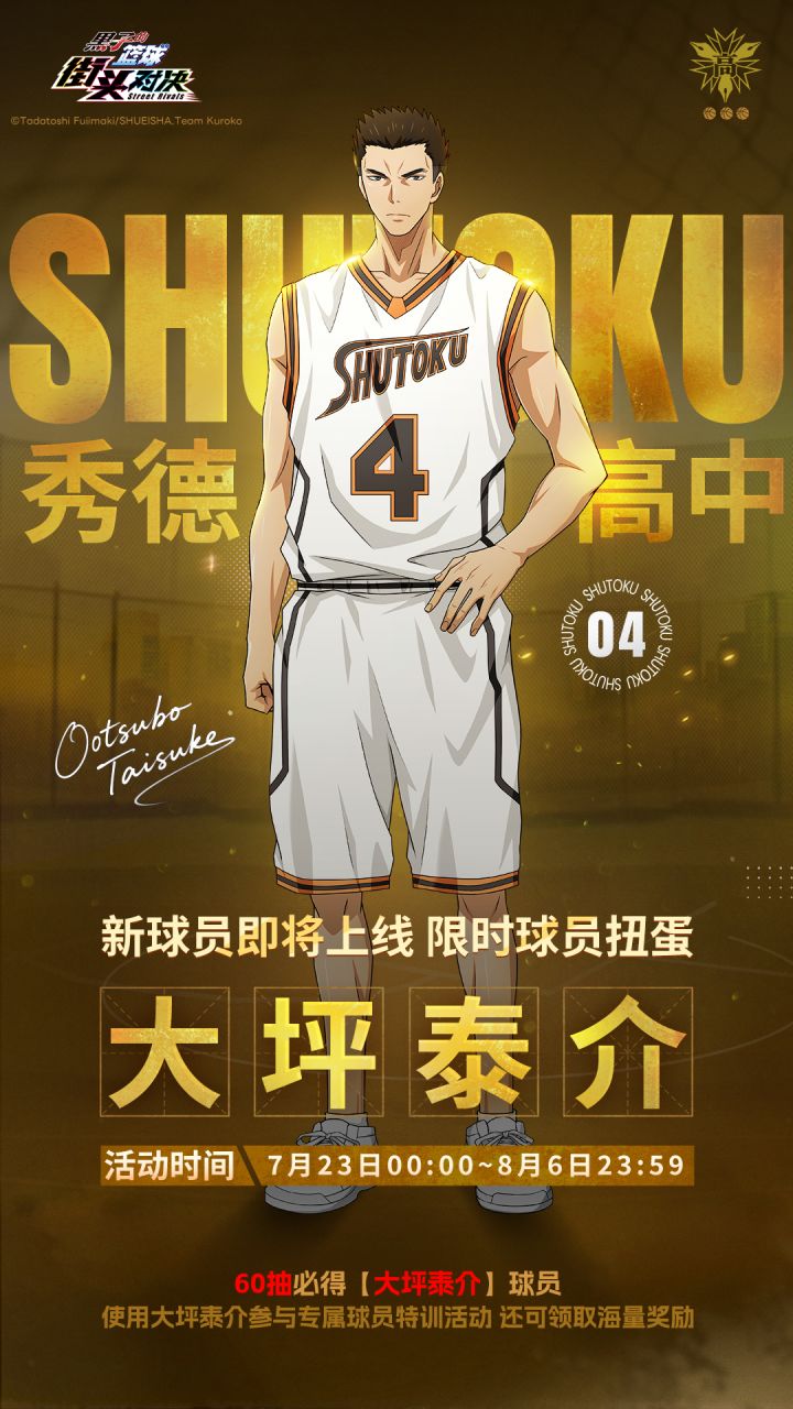 亲爱的社员:《黑子的篮球:街头对决》7月23日内容更新!具体如下:【扭蛋更新内容】▌大坪泰介—限时球员扭蛋全新球员「大坪泰介」限时登场!活动期间,可在「限时球员夺宝(大坪泰介)」中抽取,本卡池为不放回卡池,最多60抽必得「大坪泰介」球员卡!▌苍风疾影活动时间:7月23日-8月6日活动期间,可在「苍风疾影」卡池中抽取「大坪泰介 苍风疾影」限定皮肤!【活动更新内容】▌大坪泰介特训活