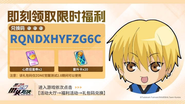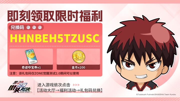大家都拿到ZONE火神了吗?ZONE觉醒测试2.0开启第二天,别忘了去领连续登录游戏2天就能免费领取的强力球员ZONE火神哦!小葵来为大家送上限时福利!进入游戏使用兑换码即可领取~兑换码:HHNBEH5TZUSC奖励:奇迹夺宝券x1;金币x200后续福利,敬请期待~【预约渠道】👉 官方预约页:https://kuroko.dyyfgame.com 👉 App Store预约:ht