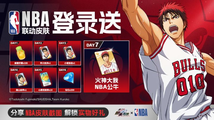 《黑子的篮球:街头对决》x NBA联动火热进行中!连续登录7天,即可免费领取【火神大我-NBA公牛】皮肤,热血馈赠,等你来拿!还未开始的社员们现在登录,依然来得及追上进度,领取联动皮肤哦~🏀 晒皮肤,赢好礼!【活动时间】活动时间:即日起 - 2025年7月27日 23:59结果公布:活动结束7个工作日内【参与方式】在评论区晒出火神大我-NBA公牛皮肤获取截图即为参与成功!【活动奖