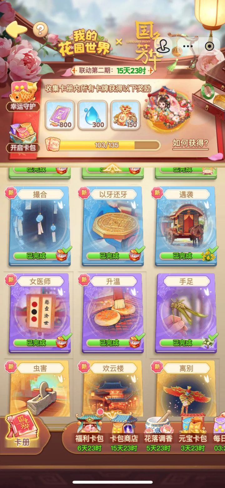 国色二期联动 冲繁花/拿琼台玉露双攻略 不冲繁花的玩家看这里:活动期间一定要把妙手护花、花落调香、曲水流觞三大核心任务全部做满,不留任何奖励缺口。7-10号、17-20号、27-30号这三个时间段的元宝卡包必须全部拉满,卡包商店里能用元宝兑换的额度也千万别浪费。 过程中如果缺三星卡就优先兑换三星,缺四星卡就及时补四星,这里划重点——切记不要着急兑换,一定要等到活动末期再统一清点所有卡的库存