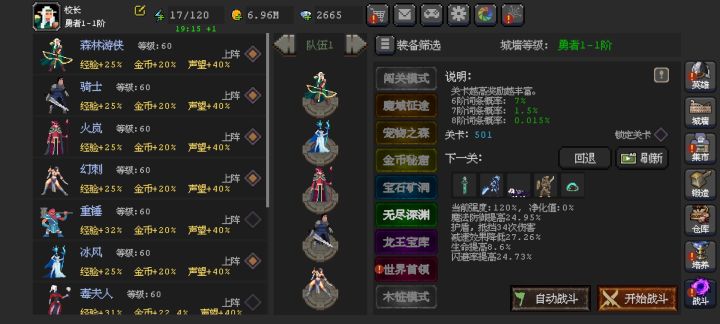 玩了五天,仅个人前期搭配(骑士,血刺,森林游侠,重锤,法师)*重锤的绝招清理杂兵很快,伤害高点基本上可以刷屏,搭配回复怒气的装备,基本上杂兵碰不到城墙。重锤CD期间配合法师绝招清理杂兵。*骑士的绝招有伤害和加深怪物百分之五十的承伤,配合血刺的绝招,能快速降低boss的血量。需要提前留骑士和血刺绝招CD打boss,杂兵纯靠重锤绝招清理。(实际上血刺绝招怒气CD时间,和一波杂兵出兵时间相同,刚好可