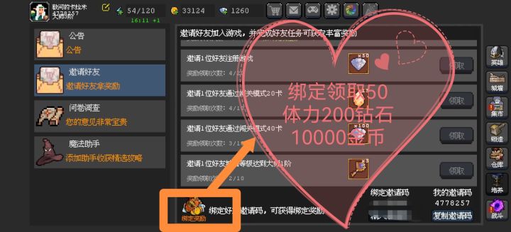 冒险者你好。我正被流放暗黑之境,绑定我的邀请码:4778257。即可获得专属好礼,助你我开启<魔法之路>!https://www.taptap.cn/app/739311绑定礼包有50体力10000金边200钻石50宠物蛋