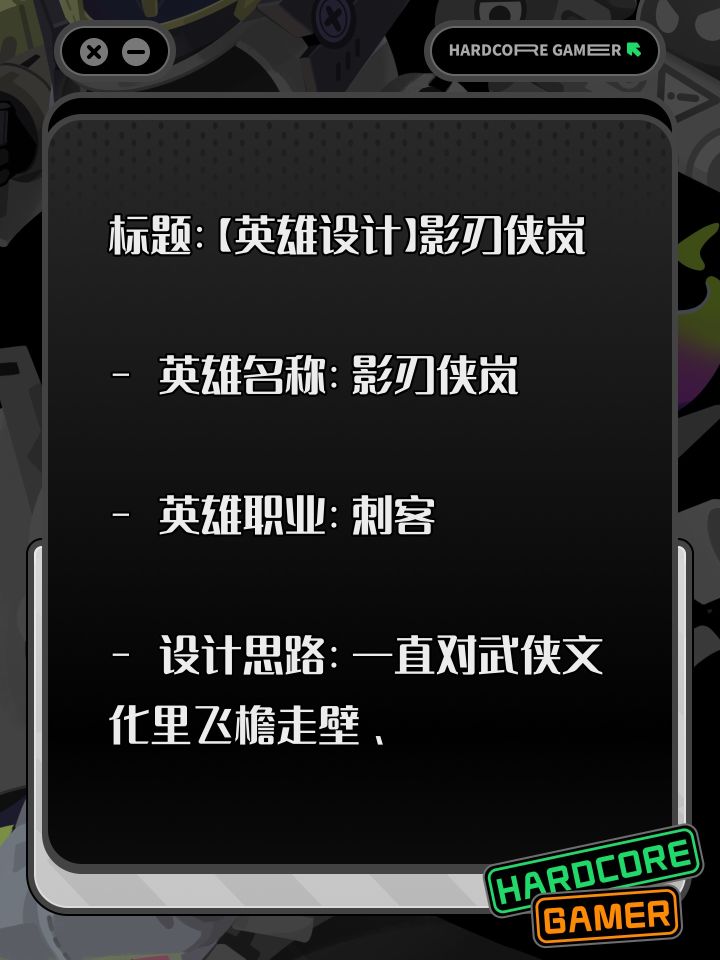标题:【英雄设计】影刃侠岚- 英雄名称:影刃侠岚- 英雄职业:刺客- 设计思路:一直对武侠文化里飞檐走壁、神出鬼没的刺客形象着迷,结合游戏中快节奏高爆发的战斗需求,设计了影刃侠岚。希望他能在战斗中凭借高机动性和瞬间爆发,对敌方后排关键单位造成致命打击,打乱敌方阵容节奏。围绕他可打造“一击必杀流”BD,利用其高爆发技能迅速解决敌方脆皮,让战斗走向我方优势。- 英雄描述:武器是两把造型独特的短