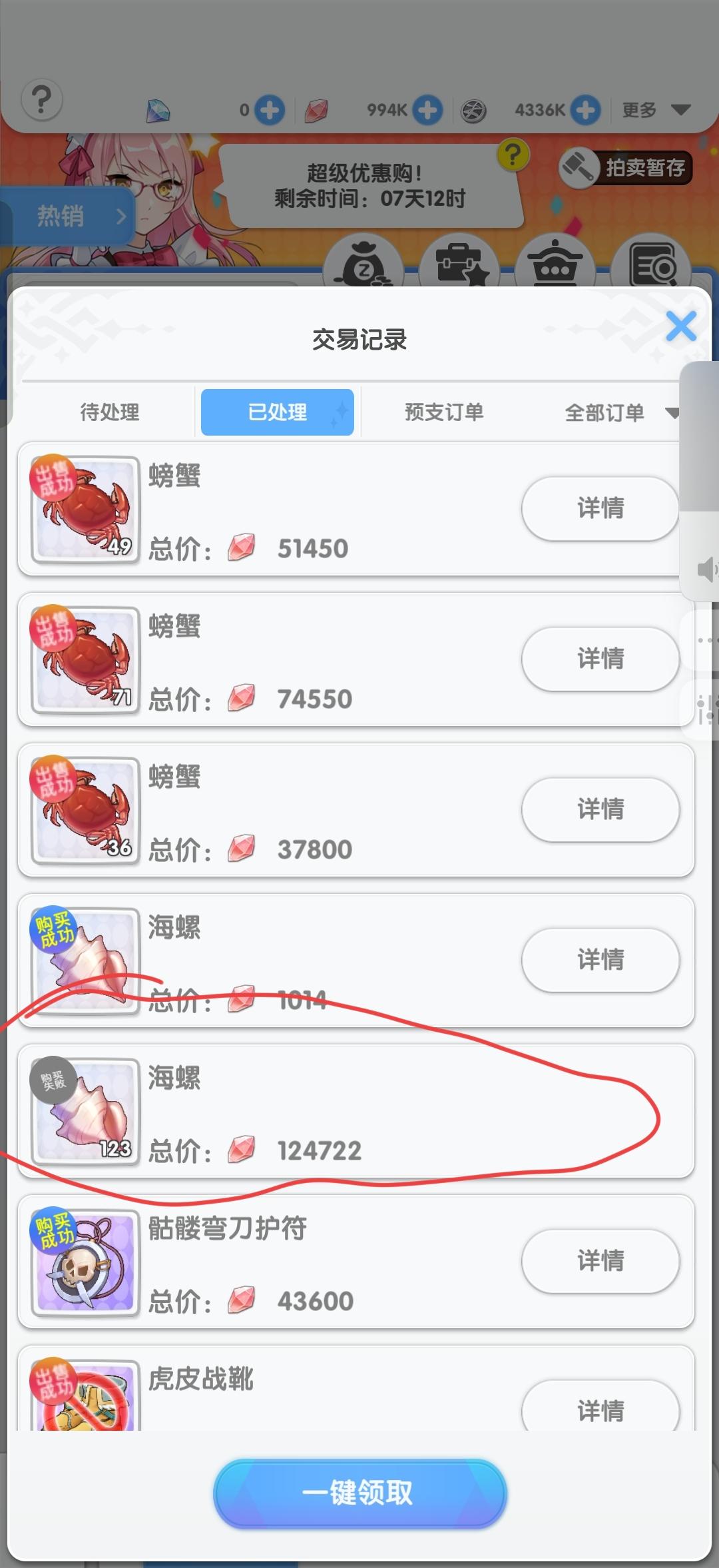 我购买了海螺,已经购买成功,在领取时却显示领取失败,我查了记录(如上图),显示购买失败,这是怎么回事?而且这条信息后面也没有“详情”,是否转正常?