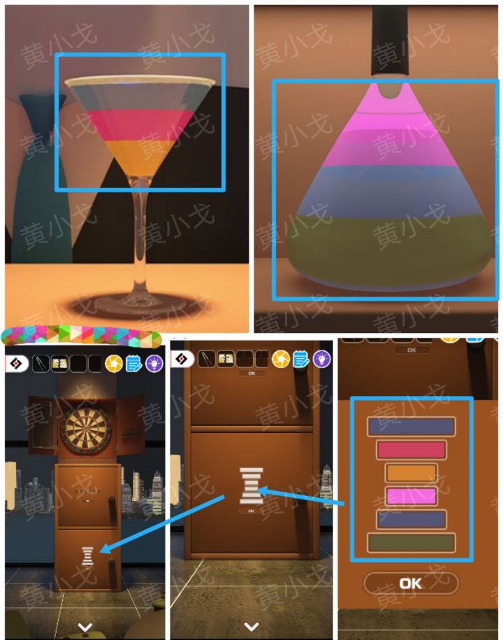 |[摇摇牛]1.点击下层柜子上的密码锁,根据[门]场景玻璃瓶上的颜色和[吧台]场景杯子上的颜色,调整密码锁🔷蓝粉黄紫蓝绿🔶[门]场景玻璃瓶上的颜色(从上到下):紫蓝绿🔶[吧台]场景杯子上的颜色(从上到下):蓝粉黄2.打开柜子,获得【胶水】3.用【胶水】把【撕开的VIP卡】粘好,获得【粘好的VIP卡】……✄……✄……✄……✄……✄……[门]4.拿【粘好的VIP卡】给猴子保安,进入