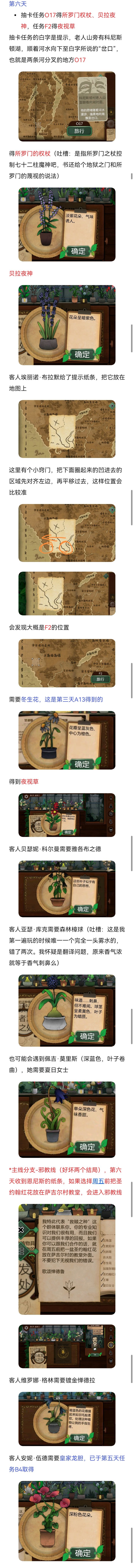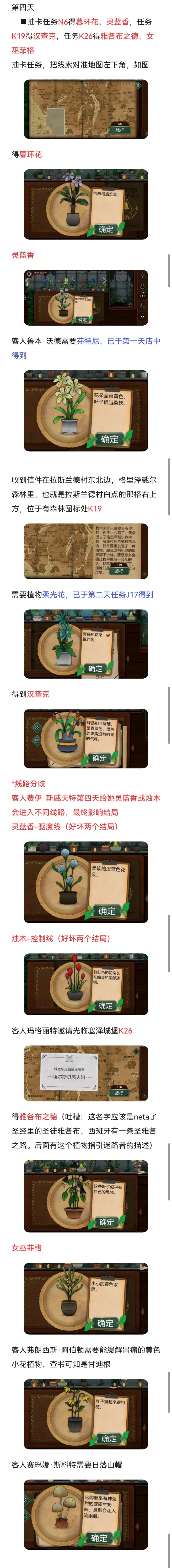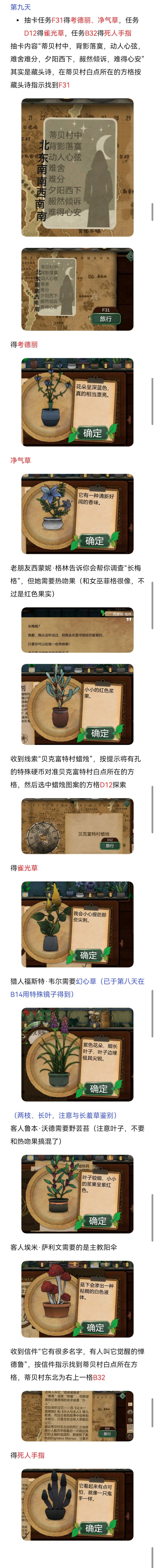 死亡代表古翠草:如果没办法理解死亡,直接#浅评一下 反过来看提示:白疤指白疤洞,西边,河边,所以在p29然后送信员的信件提示(很简单不过多介绍)随后使用农夫愁打开洞口这里来的是费伊给她苦曲花诅咒药剂:根据阿拉伯名可知,需要的花分别是往生花、汉查克(橙色小果)和幻心草下一个客人注意这里给翡翠女不同的植物会产生不同的结局这里我给的寡妇哀,随后下一个客人给他荧光角第十六天:根据卡牌文