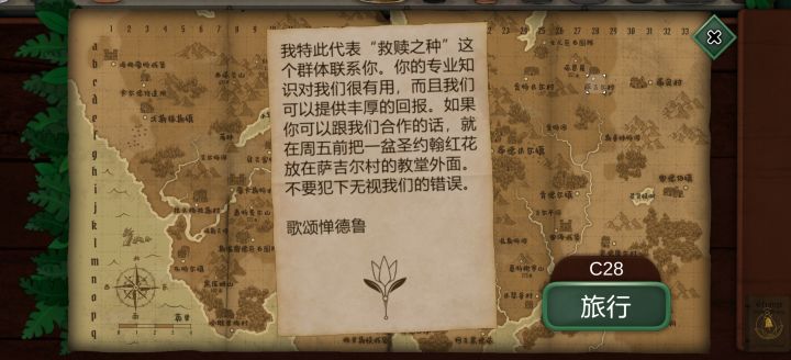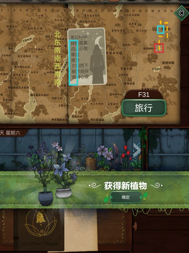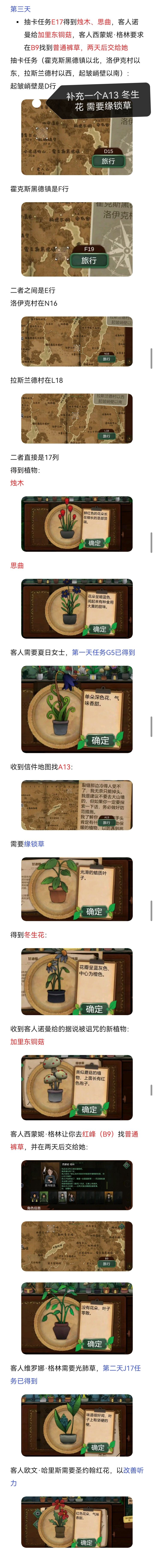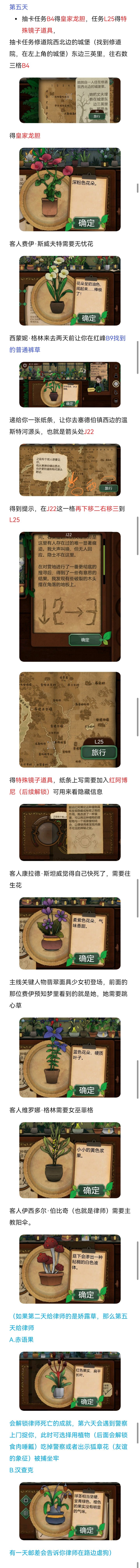 死亡代表古翠草:如果没办法理解死亡,直接#浅评一下 反过来看提示:白疤指白疤洞,西边,河边,所以在p29然后送信员的信件提示(很简单不过多介绍)随后使用农夫愁打开洞口这里来的是费伊给她苦曲花诅咒药剂:根据阿拉伯名可知,需要的花分别是往生花、汉查克(橙色小果)和幻心草下一个客人注意这里给翡翠女不同的植物会产生不同的结局这里我给的寡妇哀,随后下一个客人给他荧光角第十六天:根据卡牌文