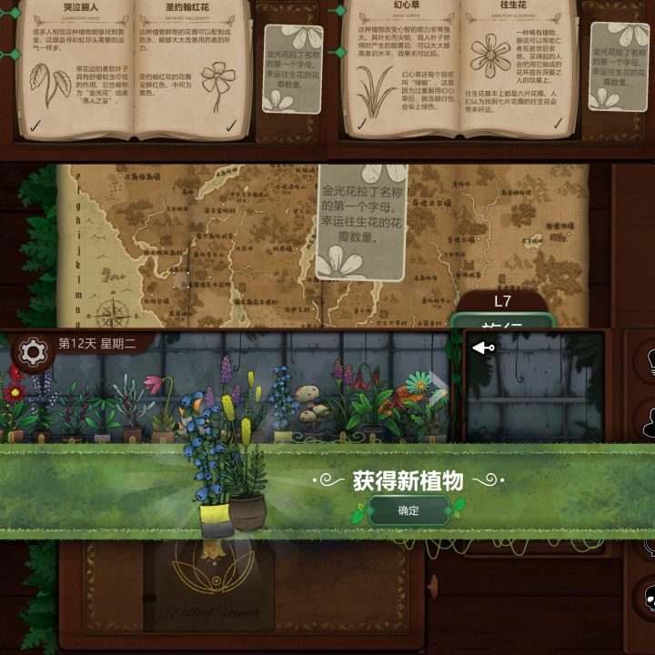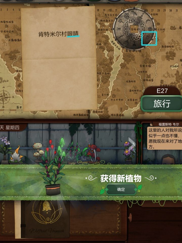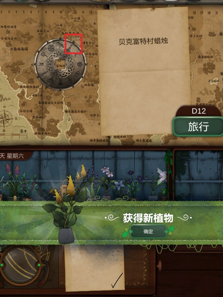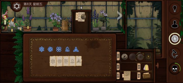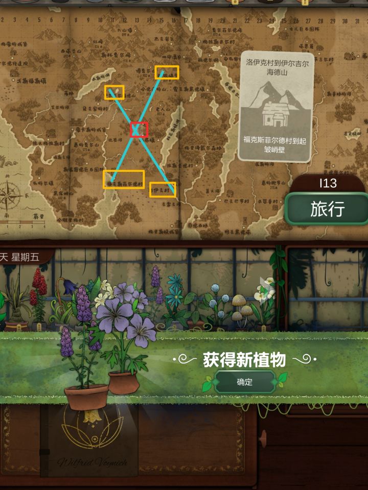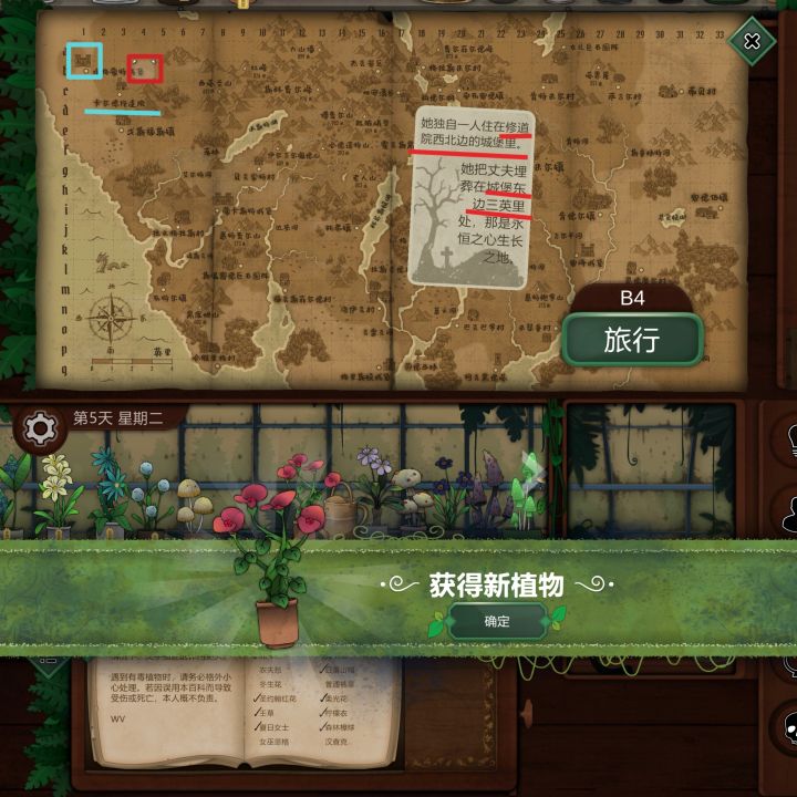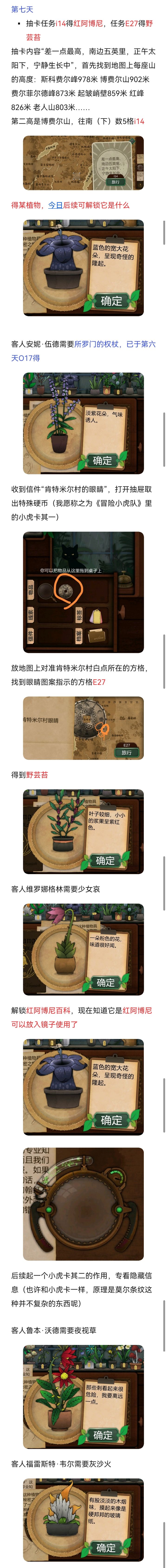 第七天1.博费尔山,第二高的山位置:I14获得:红阿博尼,与观察窗结合,后续用来看地图2.肯特米尔村,使用有图标的圆环,寻找眼睛箭头指向的位置位置:E27获得:野芸苔第八天1.4个地点相连的交叉点位置:I13获得:长羞草、普里特2.观察镜,在地图右下角寻找古翠草地点提示位置:Q30获得:古翠草3.获得5个花纹纸条,根据纸边的纹路排列,点击桌子上方的花纹,让其与下方的花