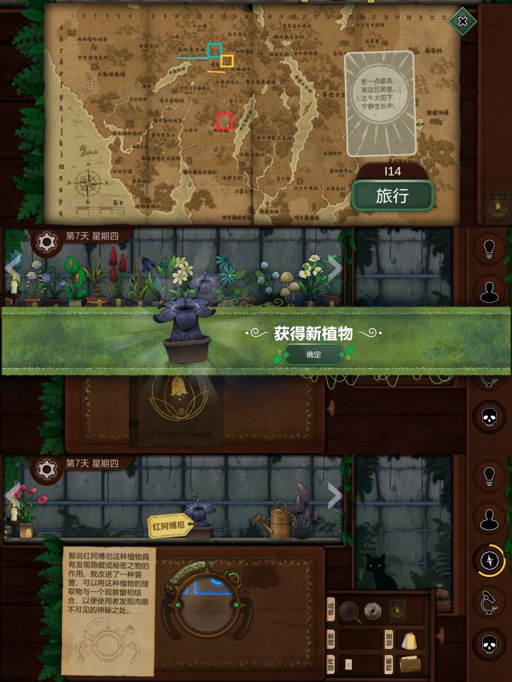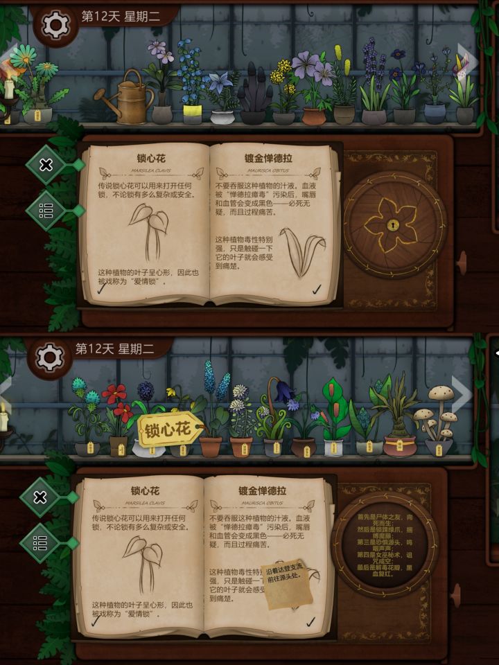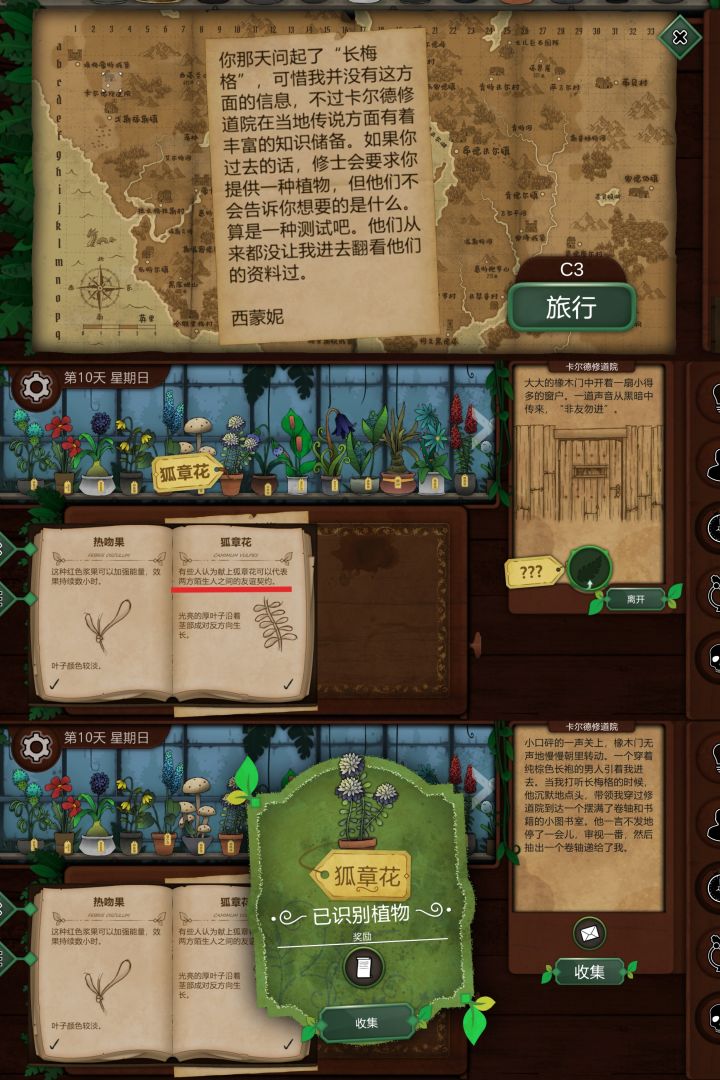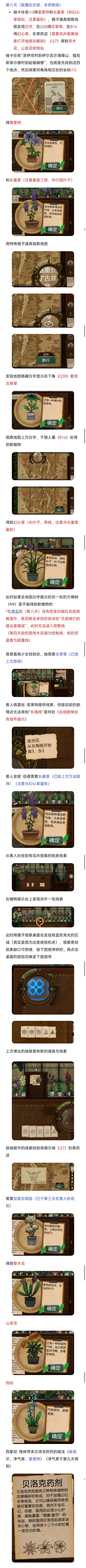 我再单独开个贴写攻略吧,问的人太多了更新第十四天,继续写详细攻略看图片本来我开这个新帖是为了写一份更详细的攻略,结果评论区还是全是提问,那我明白了,我做的是无用功。那么植物鉴别我单独开另外开一个帖子,那个帖子不会用于答疑,并且有空更完几个帖子后不会再碰这个游戏有关的任何东西了。一开始我以为大家会自己动手去解谜,不懂的地方再看攻略或提问,现在我发现大家没有这个耐心和闲心,那我也不再有耐心(