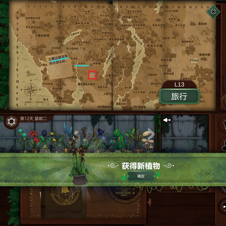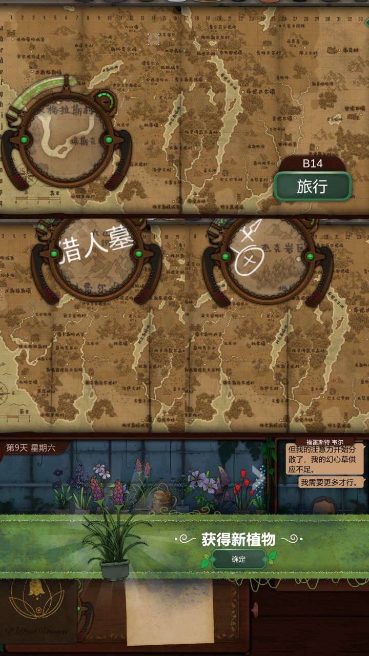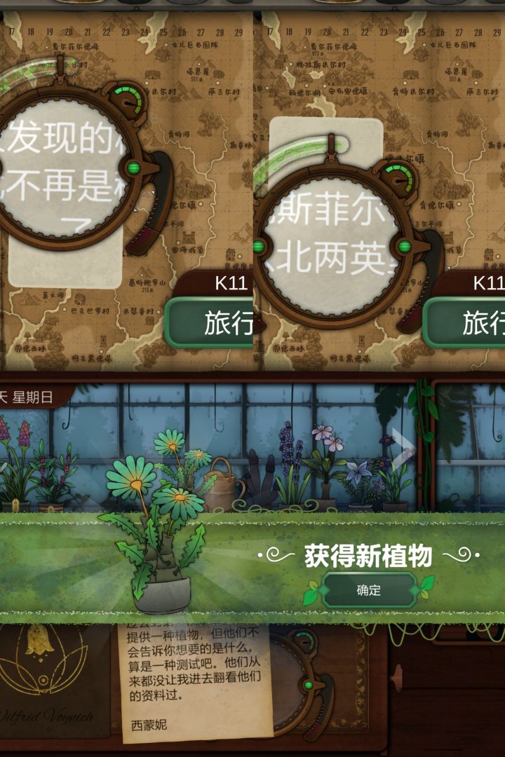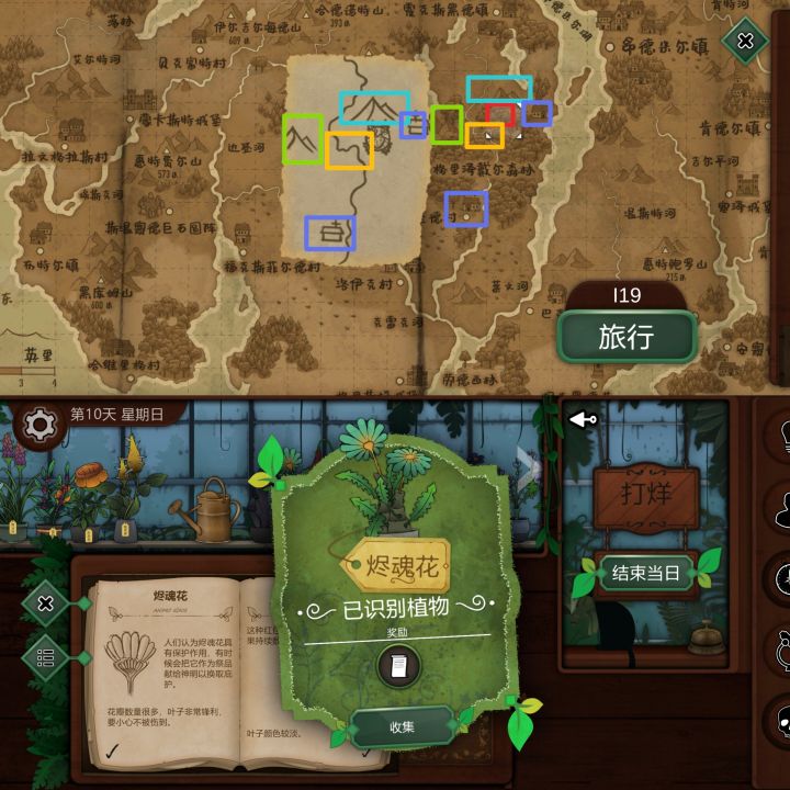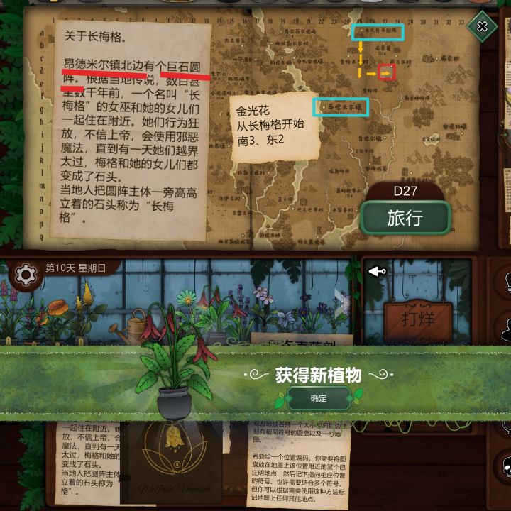 第十天1.空白纸,使用观察镜可查看,福克斯菲尔德村北边2公里位置:K11获得:烬魂花2.卡尔德修道院,狐章花解锁位置:C3获得:长梅格相关信息3.寻找金光花,长梅格=女儿巨石圆阵,南走3东走2位置:D27获得:哭泣丽人(金光花)4.与格里泽戴尔森林附近比对,用烬魂花或考德丽位置:I19获得:百科,剧情第十一天1.根据数字寻找对应海拔的山峰位置:E16获得:苦曲花2