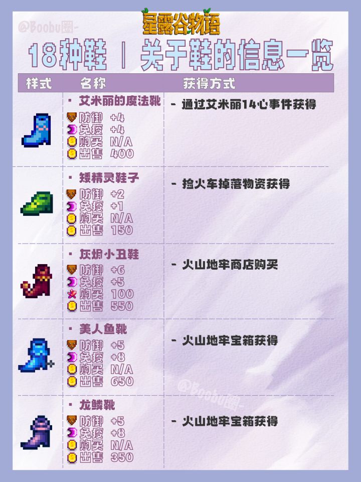 💡 游戏内一共设定有18种鞋大部分的鞋子都可以靠日常下矿打怪开宝箱获得✅所有鞋都可以在探险家工会出售,但是价格很低,建议老乡们不是很缺钱的话可以留着做日常穿搭!!日常可以收纳在衣柜当中,或者找沙漠商店🏜️买模特道具之后,就可以把鞋子穿在模特身上展出出来啦🥳#星露谷 #星露谷物语 #星露谷物语攻略 #游戏日常 #发现好游戏