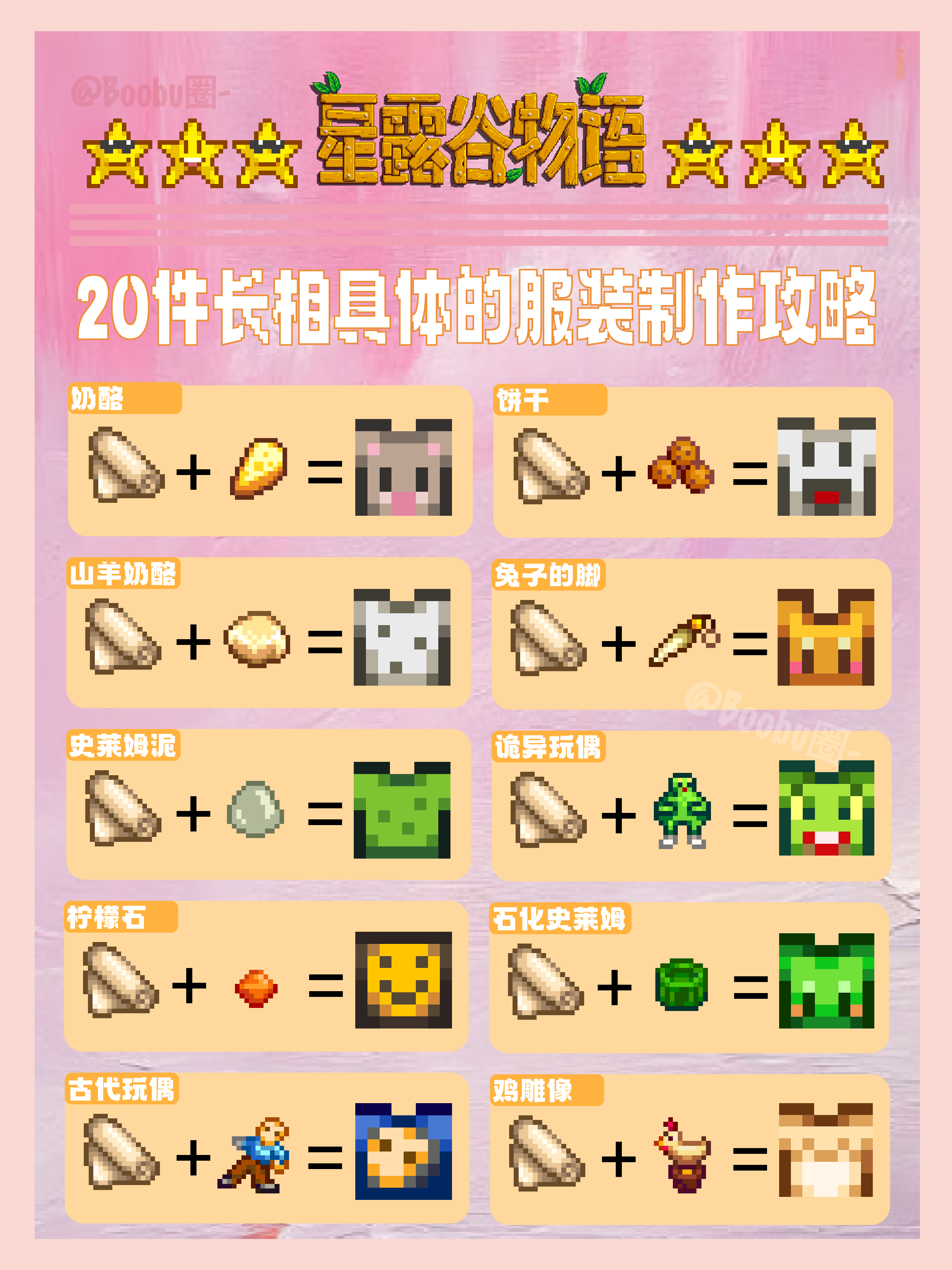 ✔️因为篇幅有限本篇攻略主要整理的是种植农作物和动物制品相关的自制衣服🐄·🧵自制服装需要使用缝纫机每制作一件衣服需要在送料口消耗1个布料及对应物品,在家里放一个衣柜家具就可以收纳所有服装啦#星露谷物语 #星露谷 #星露谷物语攻略