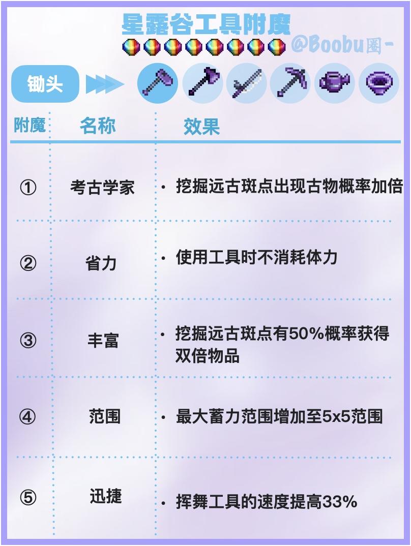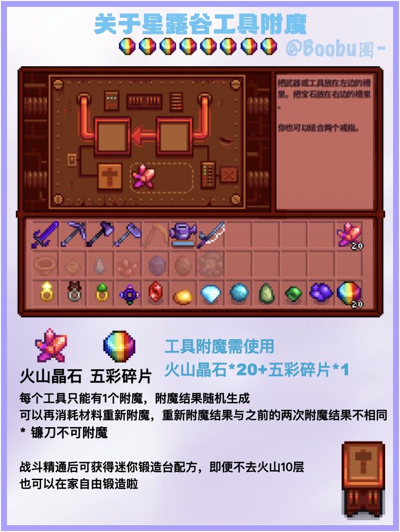 附魔需要花费一个五彩碎片和20个火山晶石🌋除了镰刀以外,所有工具都可以进行附魔不加mod的情况下每个工具只能有一个附魔✔️附魔的结果随机可以再消耗一个五彩碎片重新附魔重新附魔的结果与之前的两次附魔结果不相同附魔过的工具还是可以给克林特升级但是把带有“无底洞”附魔的喷壶给克林特升级时升级界面的容量条依然是蓝色的🩵(不会影响附魔)#星露谷 #星露谷物语 #星露谷物语攻略