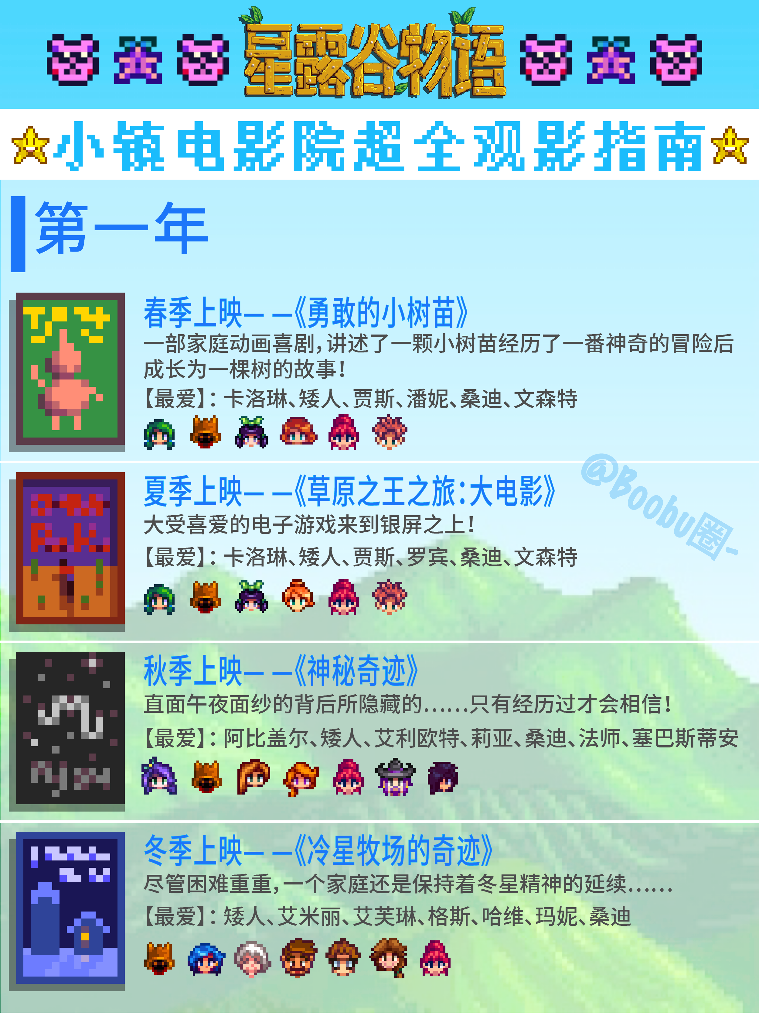 星露谷小镇重磅项目之电影院相关攻略来啦有了电影院镇上的娱乐项目更丰富了🎢·电影院里每个季节所播放的影片都有所不同不论是走献祭流或是joja流都可以解锁享受这个欢乐服务在这每 7 天可观影一次😆观影前还可以在小卖部购买美味的小零食🍿🥤也能体验抓娃娃机带走好看新奇的奖品🪆·电影院一共上映8部电影💡以每2年为一个时间循环更换电影片单所有「第一年」的电影上映过后,会上映「第二年」的电