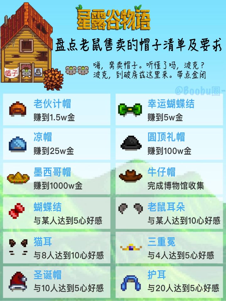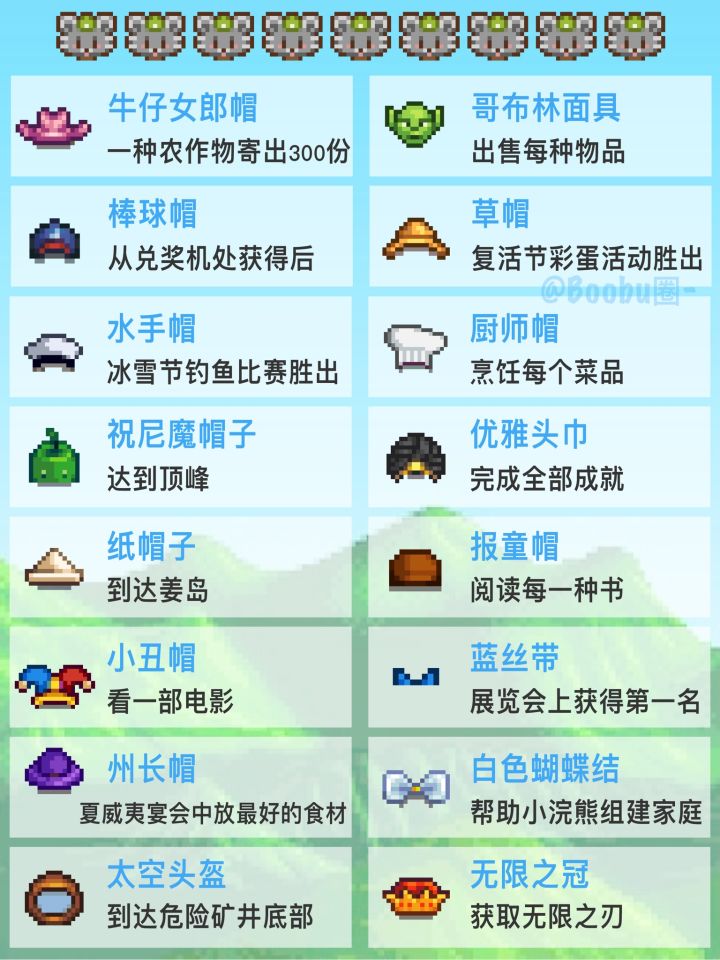 ✔️ 有个别成就在steam/ps/xbox上玩才能获得🥺✔️ 达成对应成就可以解锁游戏内指定的奖励,奖励基本是一个独特的帽子,帽子解锁后可以在煤矿森林中废弃的屋子,也就是老鼠屋子处购买✔️ 未获取的成就会在游戏菜单中显示为灰色,有一些成就要在完成其他成就后才能在游戏菜单中显示出来✔️ 个别特殊的成就会有独特奖励,可以关注游戏内的邮件噢📧#星露谷物语 #星露谷物语攻略 #星露谷