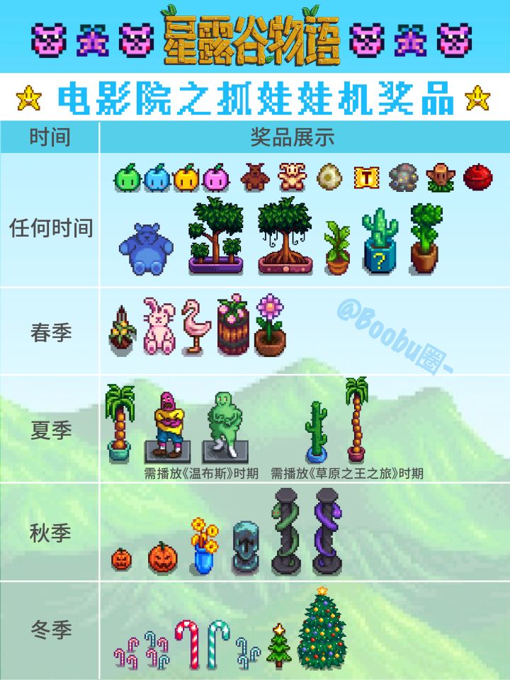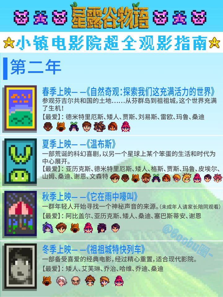星露谷小镇重磅项目之电影院相关攻略来啦有了电影院镇上的娱乐项目更丰富了🎢·电影院里每个季节所播放的影片都有所不同不论是走献祭流或是joja流都可以解锁享受这个欢乐服务在这每 7 天可观影一次😆观影前还可以在小卖部购买美味的小零食🍿🥤也能体验抓娃娃机带走好看新奇的奖品🪆·电影院一共上映8部电影💡以每2年为一个时间循环更换电影片单所有「第一年」的电影上映过后,会上映「第二年」的电