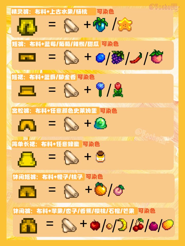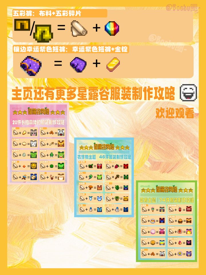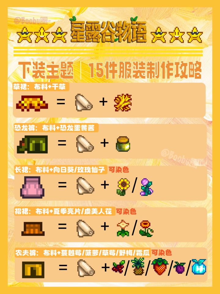 服装制作系列已经整理了农作物的、菜肴的、矿物的、长得很抽象的服装内容这次就来看看关于下装的制作攻略吧✌️有一些服装是可以再次染色的,可以看下对应服装制作配方后面有没有标记🏷️游戏中的服装除了用缝纫机直接制作,还可以通过幽灵头骨也有可能掉落灰色宽松裤和灰色休闲裤#星露谷 #星露谷物语 #星露谷物语攻略 #游戏推荐 #发现好游戏