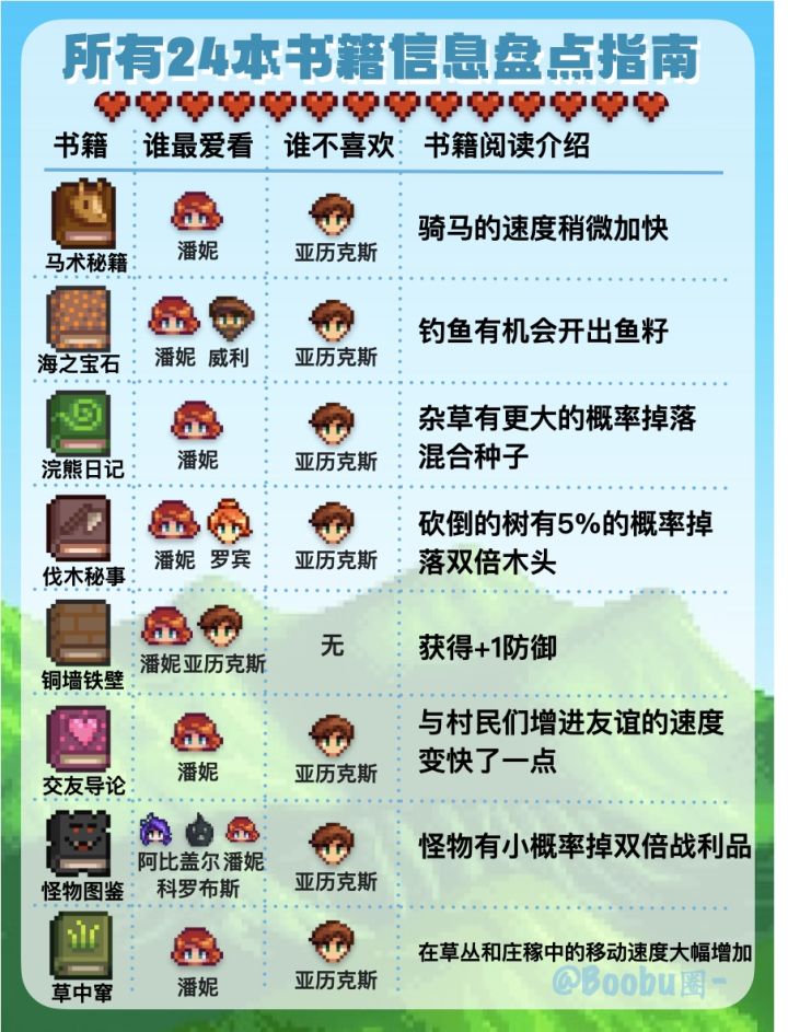 🧑🤝🧑潘妮宝宝,你是一个爱读书的宝宝😍亚历克斯则是在过场动画中有提到对看书不太感兴趣而他房间书柜上的书更是一本都没读过在书籍喜好设定上也关联起来了老乡,这5毛可千万别少玩了!!·书摊老板每个季度都会来镇上2次可以关注下日历上的日期信息除了直接买书以外在开宝箱,打怪过程中也能获得噢·祝老乡们游戏愉快🎉#星露谷 #星露谷物语 #星露谷物语攻略 #发现好游戏 #游戏日常