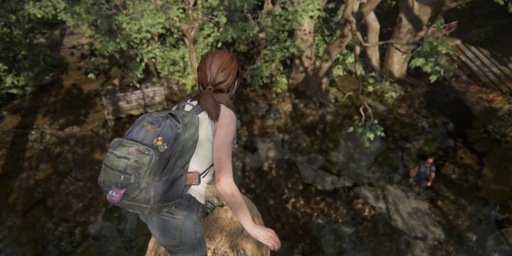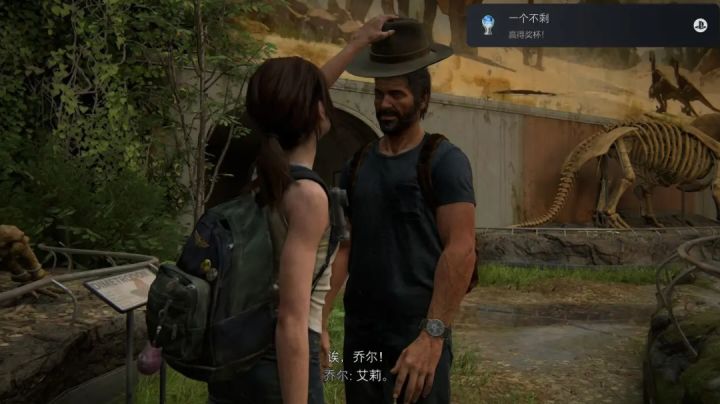 西雅图 第1天-生日礼物三年前,乔尔要送艾莉一份神秘的生日礼物。落水后,按住×上升浮出水面。按住L1加速游泳。按住○潜入水下。注意右下角的呼吸条,在水下不要停留过久,不然等呼吸条消耗完就会掉血。一路跟着乔尔来到霸王龙雕像前,沿着霸王龙的尾巴可以爬上去。在顶端来个信仰之跃。进入恐龙馆,拿牛仔帽戴到头上。逐个与各个恐龙骨架互动,可触发对话。往里走,帽子可以给剑龙戴上。然后取下帽子,给