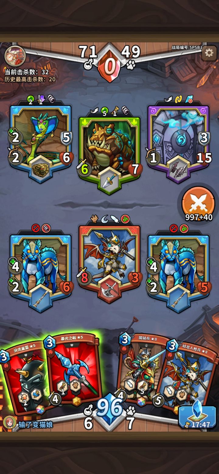 核心是双镜像法师双猫骑兵跟双能量法杖双战斧(必需划重点!!!) 其他卡可有可无 灵活搭配即可 可以看到我小号精英就一个爱丽丝和白嫖的艾斯 并没有现在主流的三幻神也是可以上到传奇的 爱丽丝可以用别的卡进行替代 不是必需品 优缺点就是红内战先手吃亏 本质是属于红流派的 用的也是冲锋红的打法 打一换一 略逊于红优于战场 打那种献祭站场一波流(说的就是你黄运) 除了被卡牌 就是压着打的 打蓝苏的话我自