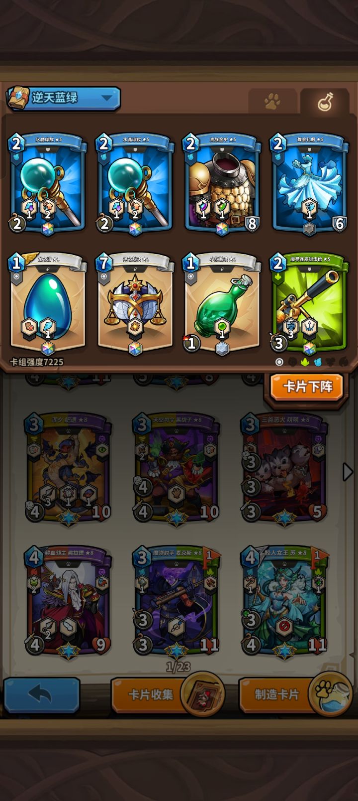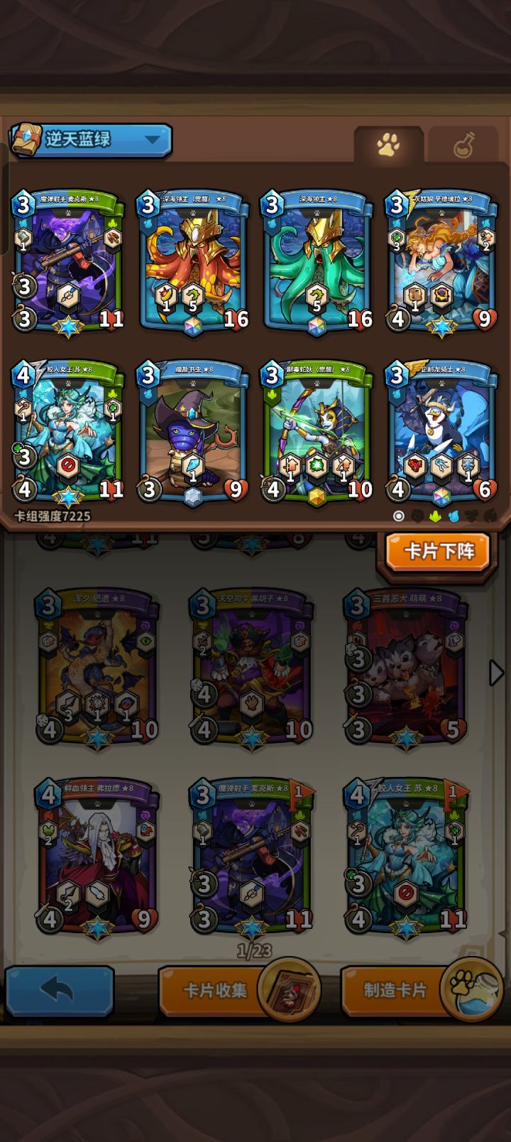 个人认为是目前蓝绿最优解,此卡组舍弃了猫姬,取而代之的是章鱼。目前环境猫姬站不住脚,且蓝绿格子太吃紧了。此卡组射手和法师可以看情况选择输出(经过一下午的评测,这卡组不太好处理青蛙应对其他卡组是有余力的)。欢迎各位高手评价