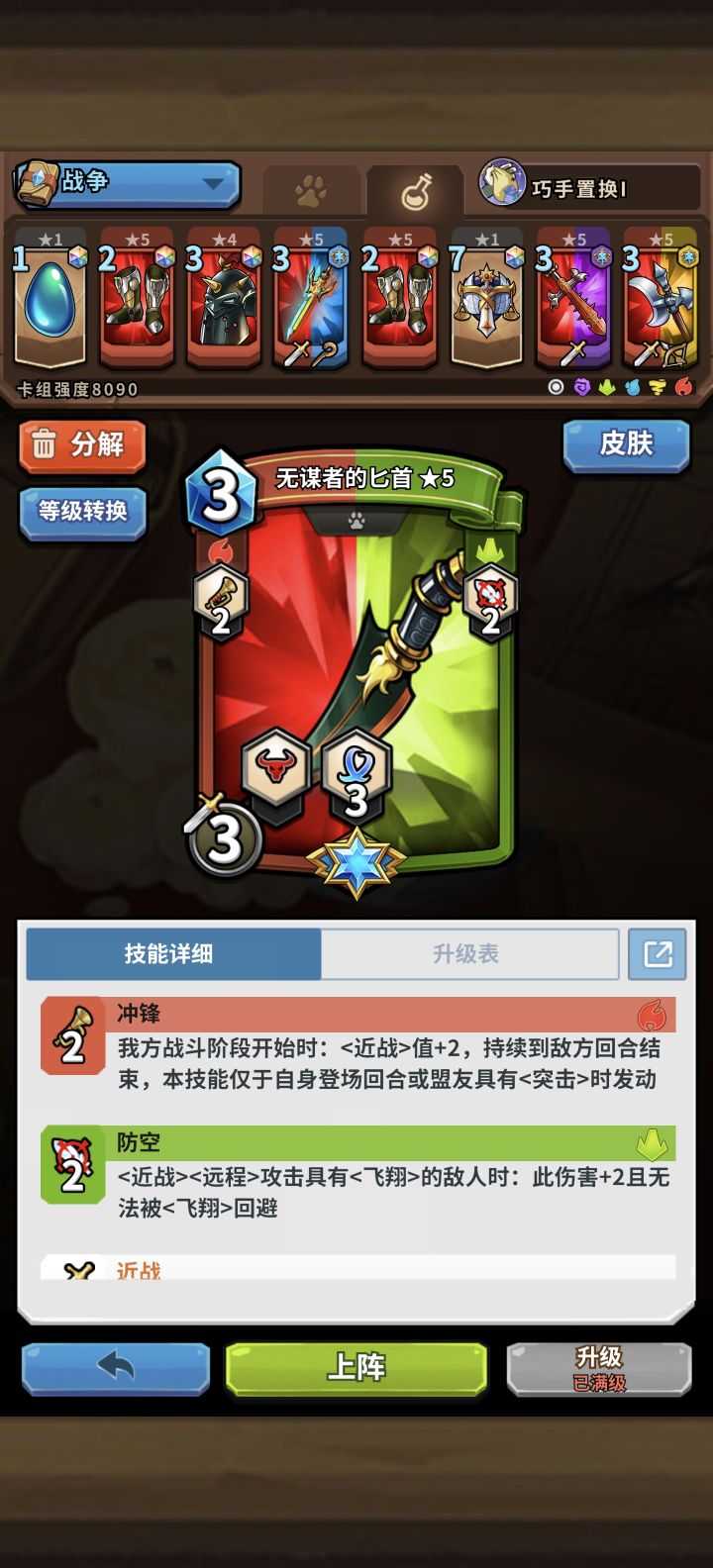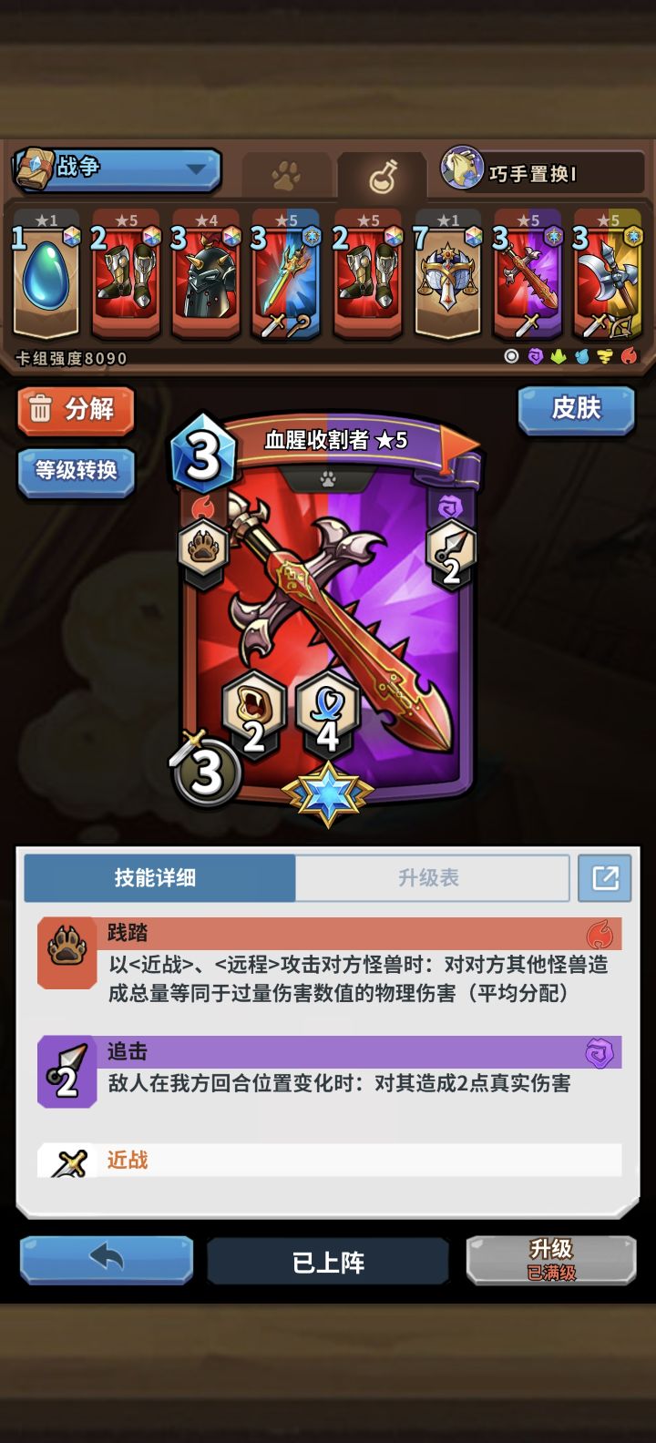 打到一百名后10场就匹配8场国王,10打7输,没有反制手段,直接扣10点血,太变态了,还复活、拿牌,这个扣血改成真实伤害或者魔法伤害,而且要低于正常怪兽的血量低于九,我的牌运非常好,最后还是输了,六成以上都是超级牌运,一直秒杀对面的怪插牌没有用,国王一登场就输了。 削弱成8真实、魔法,嗯,那个觉醒变身的技能还能再操作一下,把它变成辣鸡,卡牌和真实伤害二选一,别给他拿卡牌,打伤害就没卡牌,有卡牌就