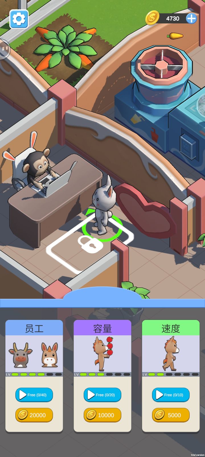 游戏还是不错的,就是有太多问题了1.那些工作的牛总是卡住,也没有解决办法,只能退出游戏重进才行2.第四个餐厅,那个牛不会去拿牛肉,只能自己去,你说这对于牛来说太残忍了,很疑惑,我觉得作为玩家,我们就是要一步一步的建造,而不是解锁了一个餐厅就让我困在那里了,而且那个桌子一次性只能放四个食物,我拿一次食物就是五个,所以我必须要等一个兔子吃了才能放下一个食物。我认为可以放一个存放食物的柜子之类,这样